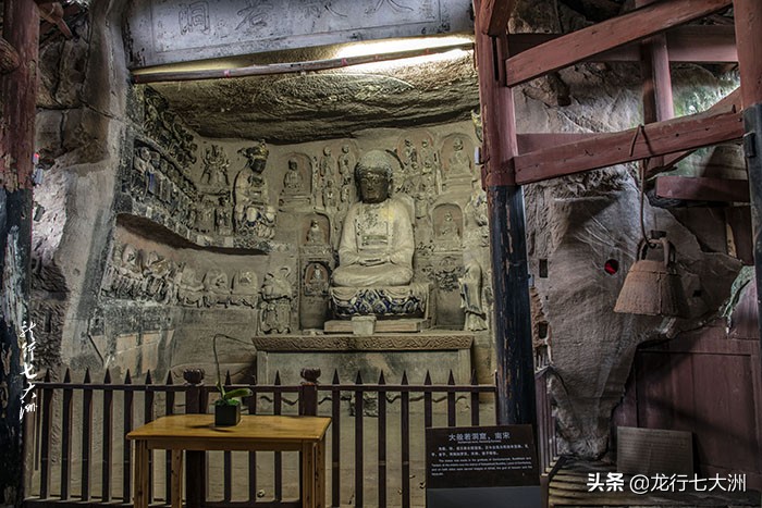 大般若洞在华严洞左侧20余米处,洞前也建有大殿,需沿楼梯登上二层才能来到洞窟的正面。大般若洞龛高4.7米,宽、深各约5米,洞额处刻有大般若洞四个大字。此窟属儒、释、道三教合窟造像,正中端坐于莲台上的是释迦牟尼佛,后两侧高处端坐的分别是老子和孔子。两廊分三层,下层列十八罗汉,中间是廿四诸天,上层塑十童子。下层的造像损毁严重,上两层造像保存基本完好。