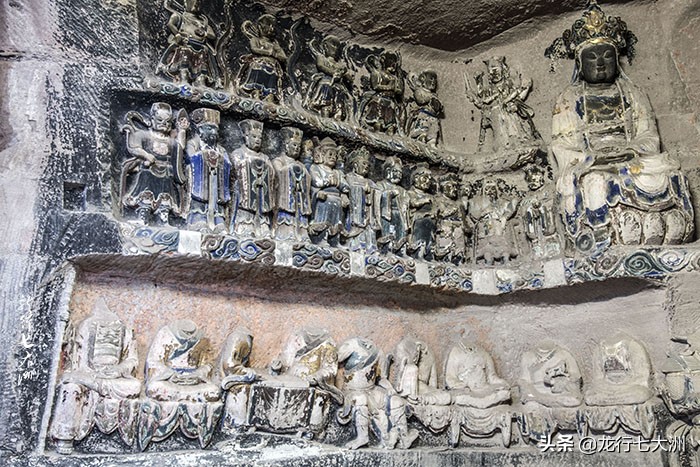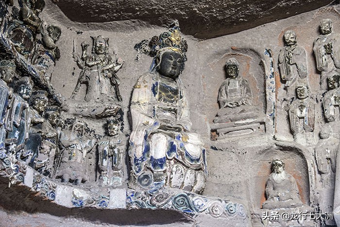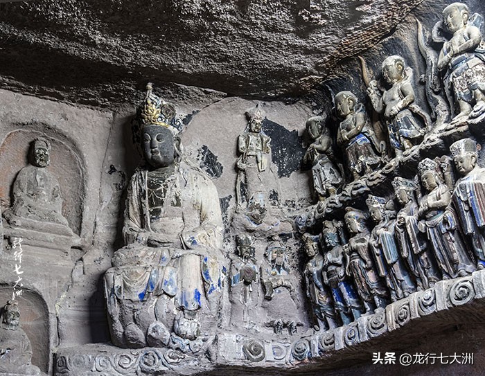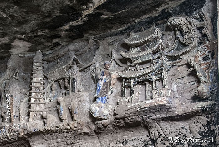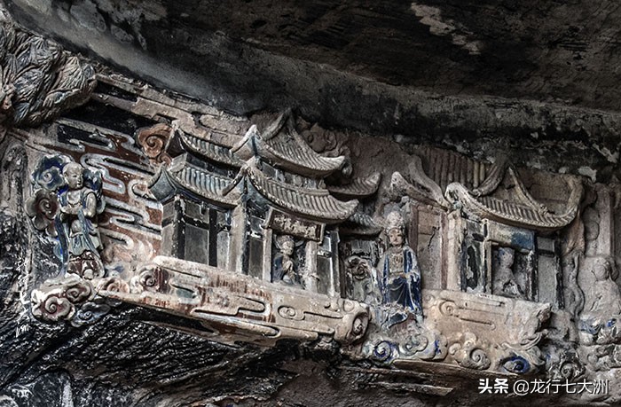 正壁两角还有两个高3米、表情十分虔诚、两耳恭听佛法的木犍莲、舍利佛二弟子站像,佛前和两边均设有仿木石雕供桌。佛的左右两臂排列着10尊通高4.1米的菩萨(又称十大弟子),两壁顶部浮雕《善财童子五十三参求法经变图》,共有10组亭台楼阁、花草树木、飞禽走兽、飘渺云彩以及各类人物,均呈现在云层之上。