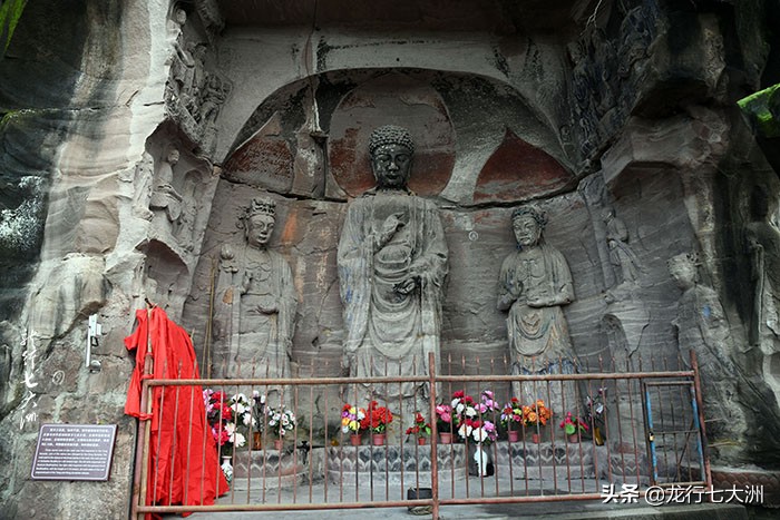 “西方三圣”龛,为北宋在唐窟基础上改凿而成,侧壁上仍留有明显的唐代造像。龛高6.62米,宽5.2米,深3.2米,主尊阿弥陀佛高4.1米,大势至与观音菩萨高3.1米,其中陀弥陀佛头像有明显的修复痕迹。