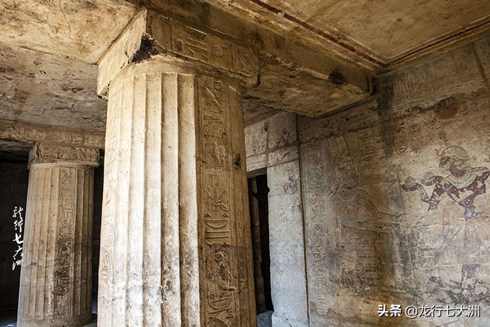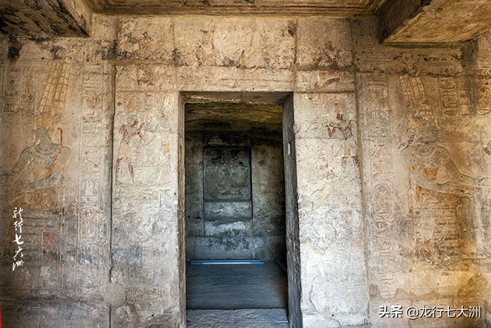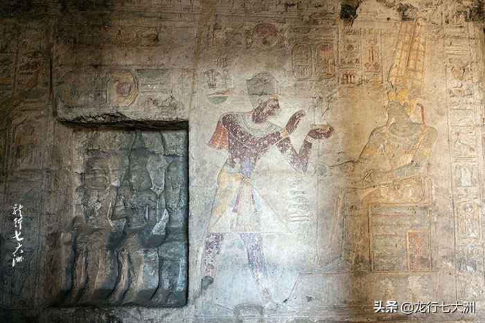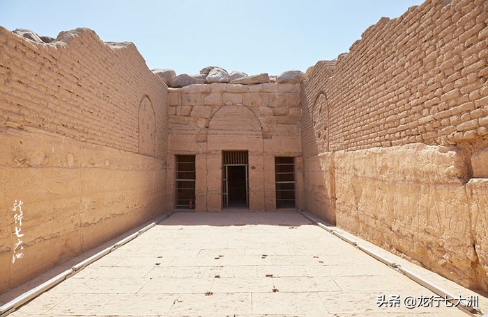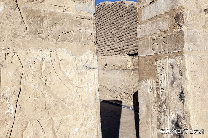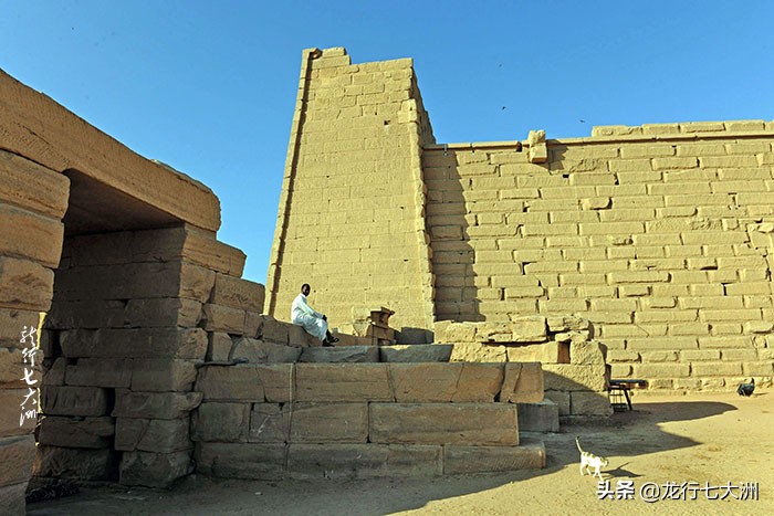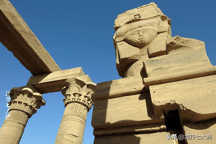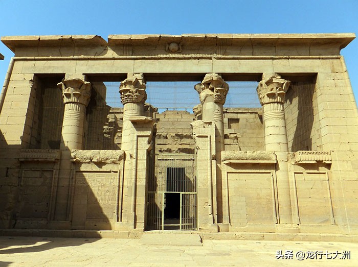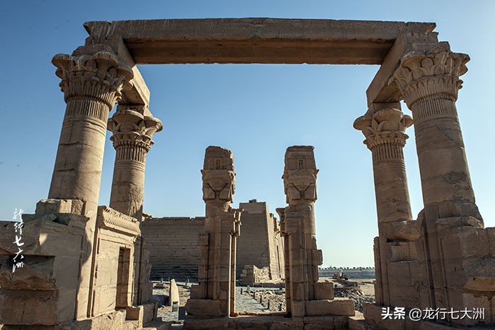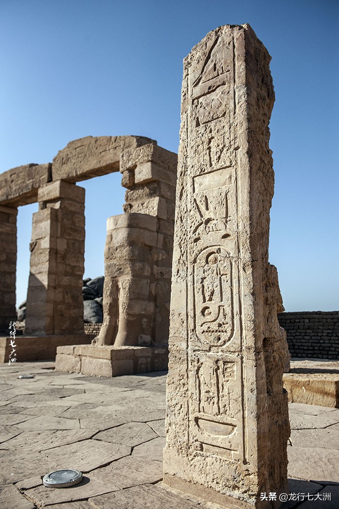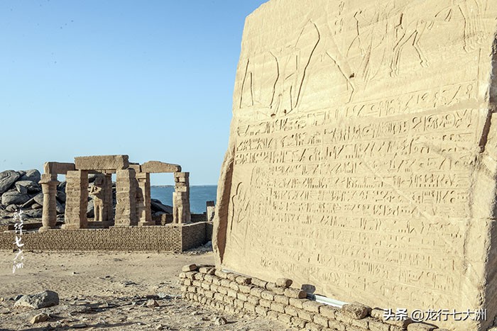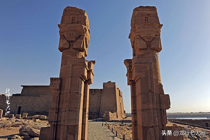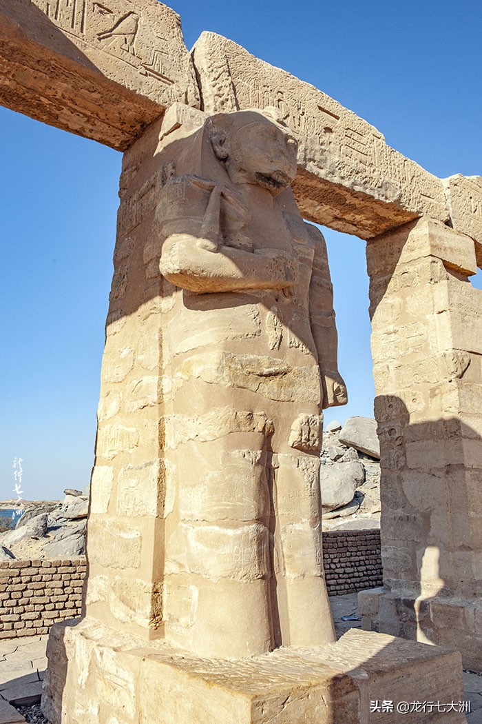 卡拉布萨神庙寺庙长76 m,宽22 m,是三神庙中最大的,我到来的时候,不知何原因,卡拉布萨神庙关闭,只能拍到几张外景。据资料介绍,湖边有一道石堤一直通往神庙的第一塔门,穿过塔门就是列柱庭院和有八根柱子支撑的多柱大厅。墙上壁画描绘的是各位帝王或法老和诸神在一起的图景。多柱大厅往里便是带三个房间的圣殿,其中一个房间的楼梯通向房顶,从那里你可以越过大厅和庭院欣赏到纳赛尔湖和大坝的无限风光。