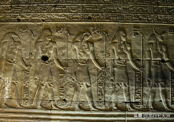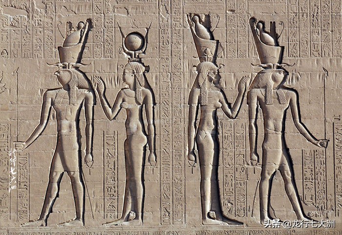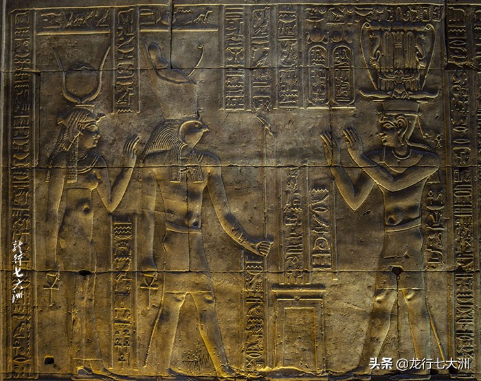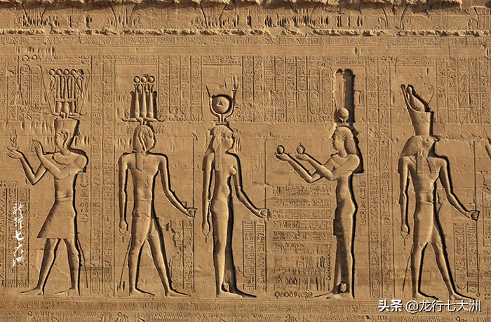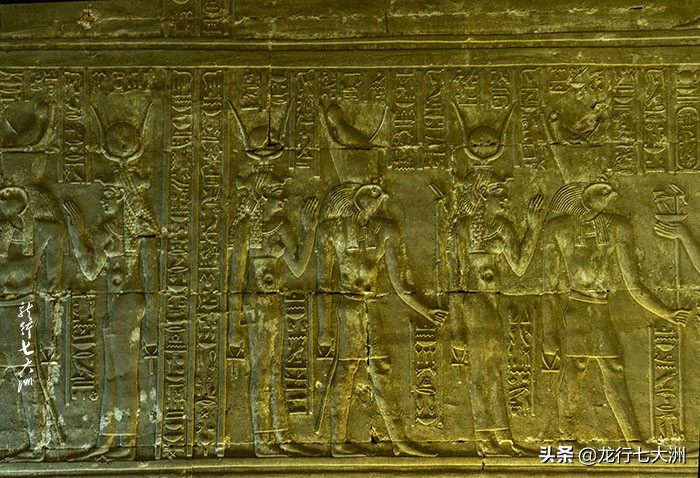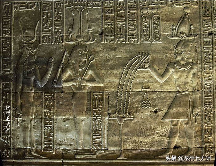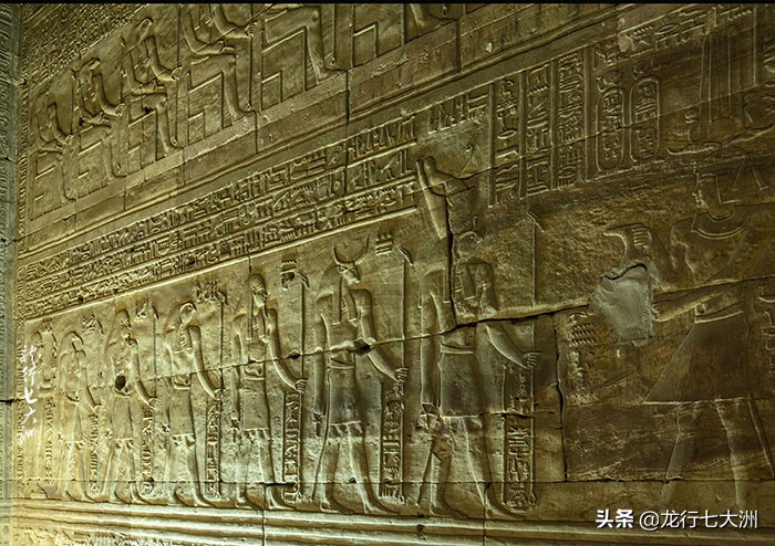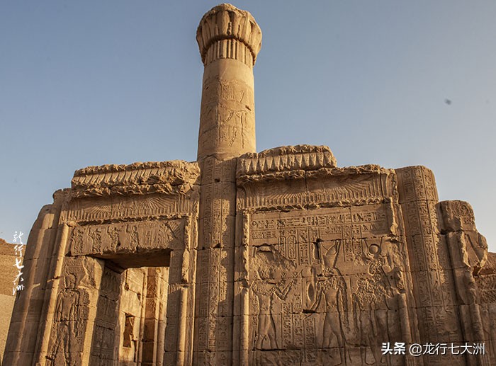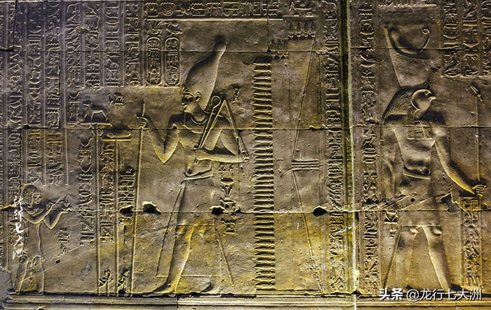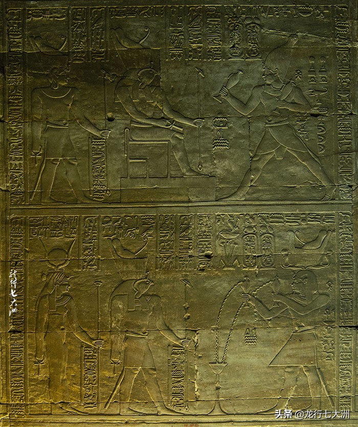 塔门上的描绘了浮雕托勒密十二世在鹰首人身的何露斯及女神哈索尔面前打败敌人的场景