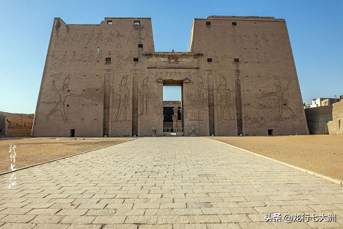 穿过旧的遗址区,何露斯神庙高高的塔门就在眼前。这座塔门高36米,是埃及第二大的塔门,巨大的塔门由两尊精致巨大的鹰形何露斯黑色花岗岩雕像看守着。在塔门的墙壁上装饰着左右对称巨大的浮雕,描绘的是托勒密十二世在鹰首人身的何露斯及女神哈索尔面前打败敌人的场景,托勒密十二世拖着敌人的头发,预备在何露斯面前打碎他们的头骨,这是一种展示法老威力的传统场景。