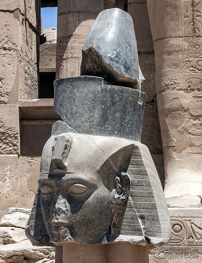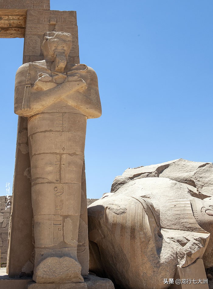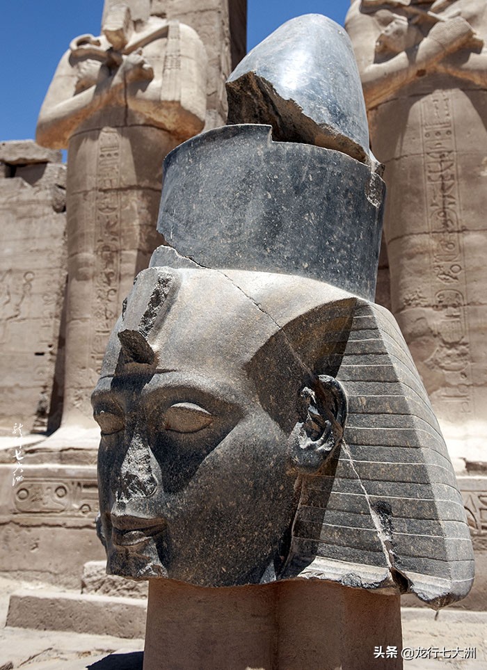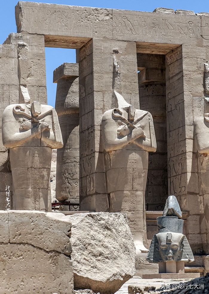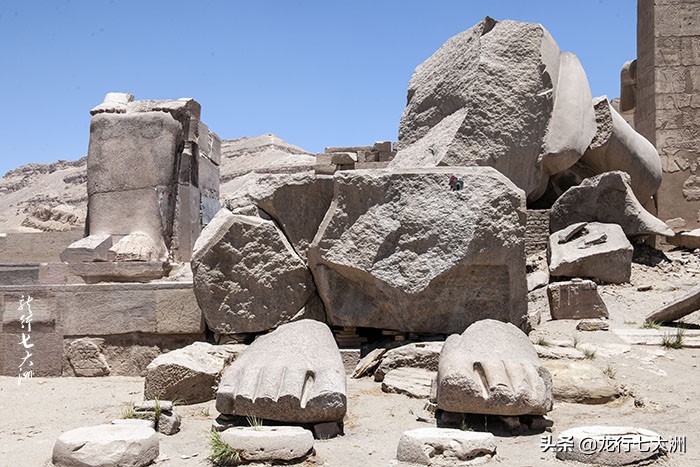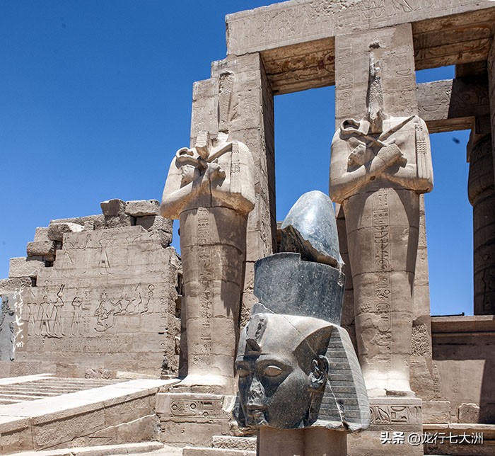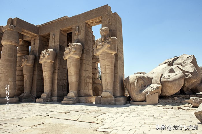 在第一靠近西边楼梯的拉美西斯二世巨像还剩下一部分,这就是雪莱诗中的奥西曼提斯,它曾经高达17.5米,如今却凄凉地躺在地上。一对用花岗岩打造的拉美西斯二世雕像,现仅剩的一尊,但头部已断了,落在第二庭院的地上。