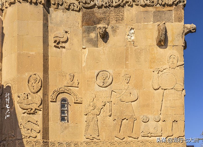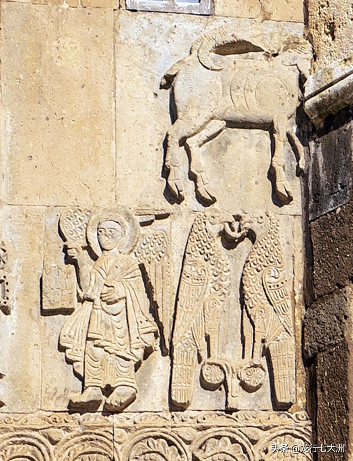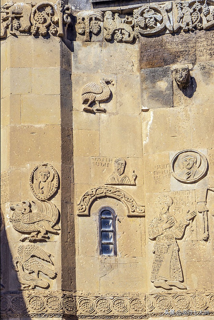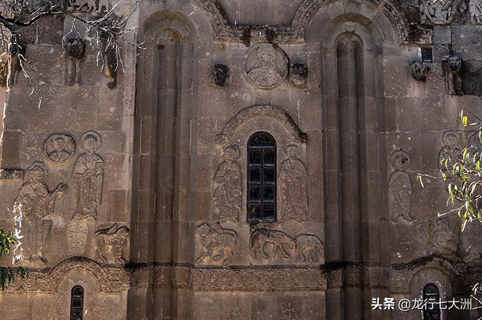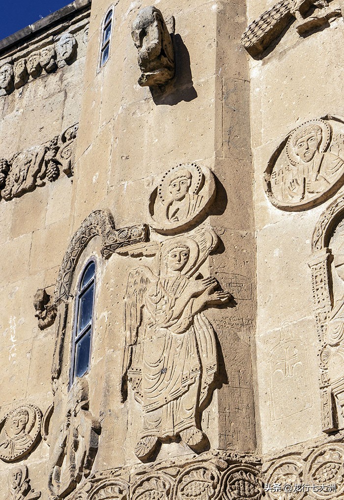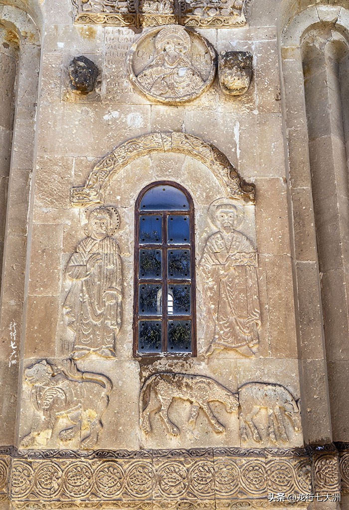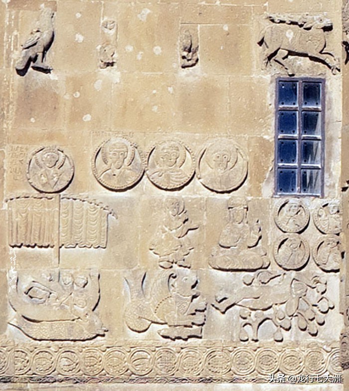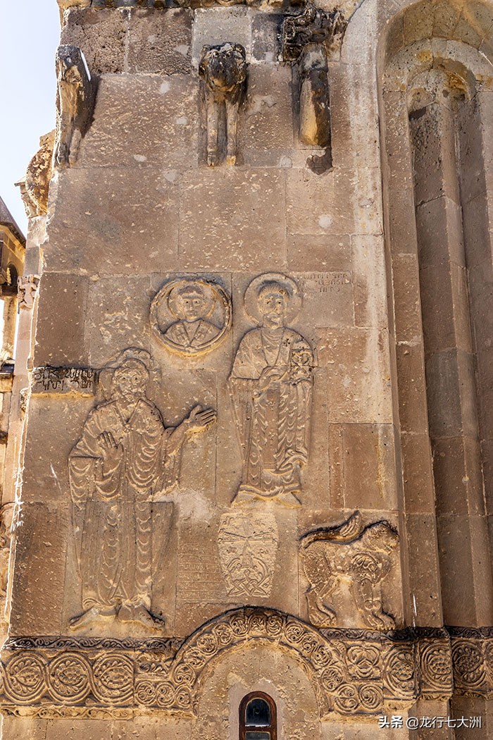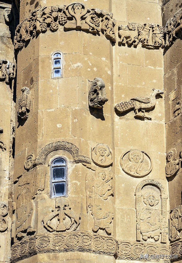大教堂外墙上精美的浮雕堪称亚美尼亚艺术中的极品。如果你熟悉圣经故事,你会立刻认出亚当和夏娃、约拿和鲸(长着狗头)、大卫和戈利亚、将要杀子祭主的亚伯拉罕、狮坑中的但以理、参孙等。我并不能区分这些浮雕,只能把拍到的照片供大家欣赏。