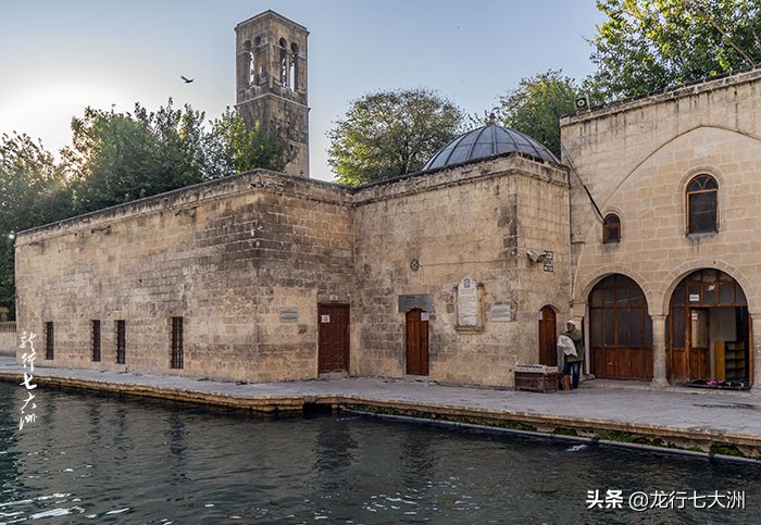 紧邻水池和公园东南面的是德加清真寺Dergah 清真寺群和公园,先知易卜拉欣出生岩洞(Hazreti brahim Halilullah )带柱廊的庭院就在里面。作为一个著名的朝圣点,这里几个世纪以来都在不断建筑和重建。其西部边缘是引人注意的梅夫利德-哈利尔·卡米(Mevlid -i Halil Cami)清真寺,一座巨大的奥斯曼风格的清真寺。