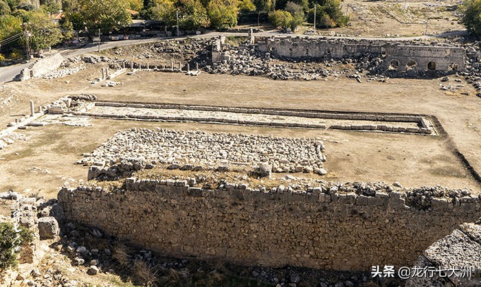 与体育场平行的是一个顶端有两层楼,长150米宽15米的大市场,在其西壁有小的矩形门和大的拱形门。该建筑由精制的方石砌成。在南端是一栋较宽的建筑,有几个房间和四个大拱形门,通过拱形门,可观赏山前的体育场和山上的城堡。