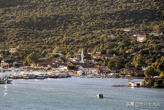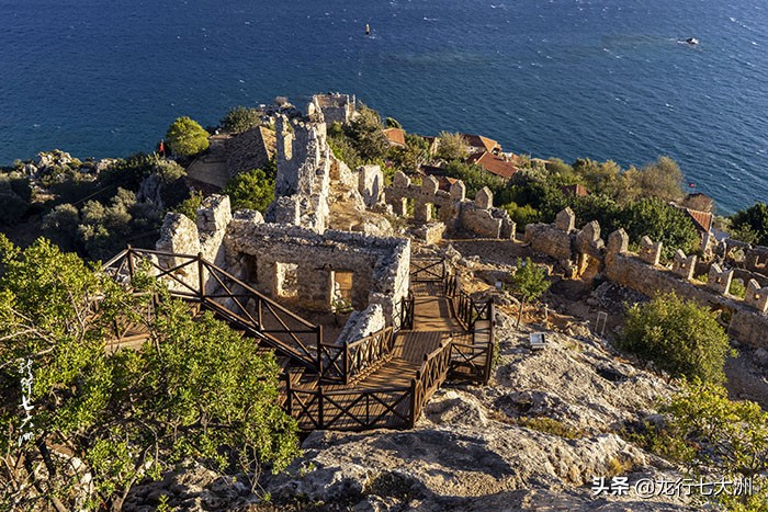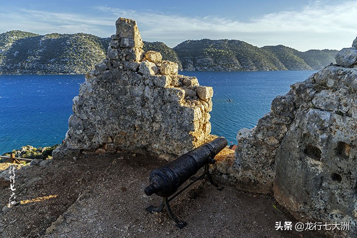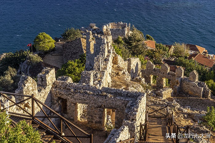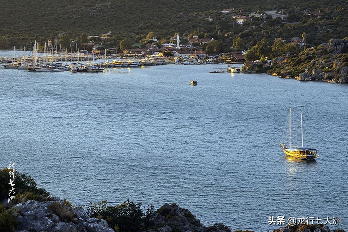 站在城堡上可俯瞰海湾的美丽景色,远眺对面卡列科伊岛夕阳中的清真寺尖塔、游艇和小镇。
