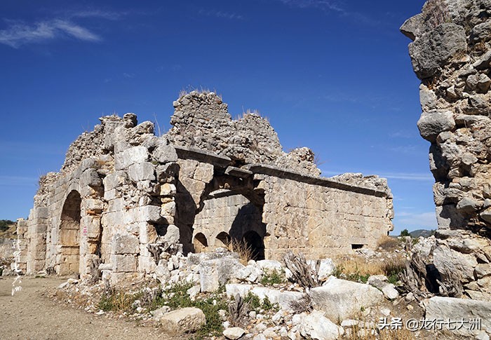 大浴室位于卫城西南部的斜坡上,是罗马早期建造的,在公元二世纪和三世纪进行了翻修,并在十一世纪被改建为教堂。其结构遵循典型的利西亚浴室的平面图。浴室的东面有一个纪念性的门,还有一间带有七扇拱形窗户的房间。