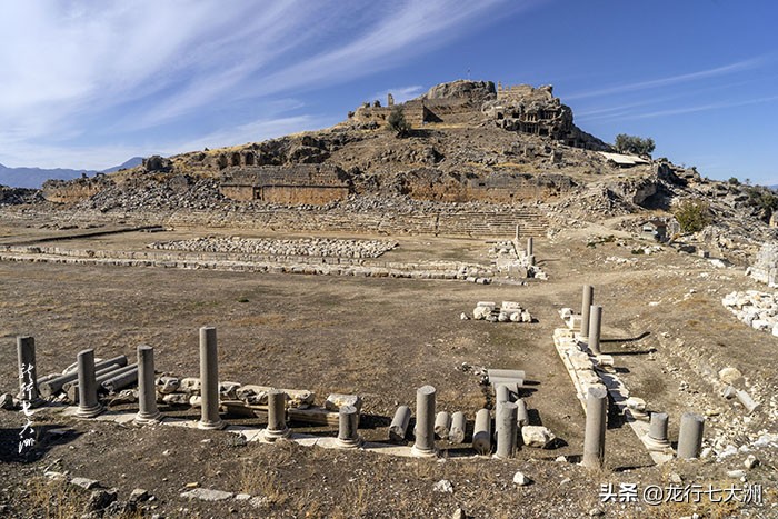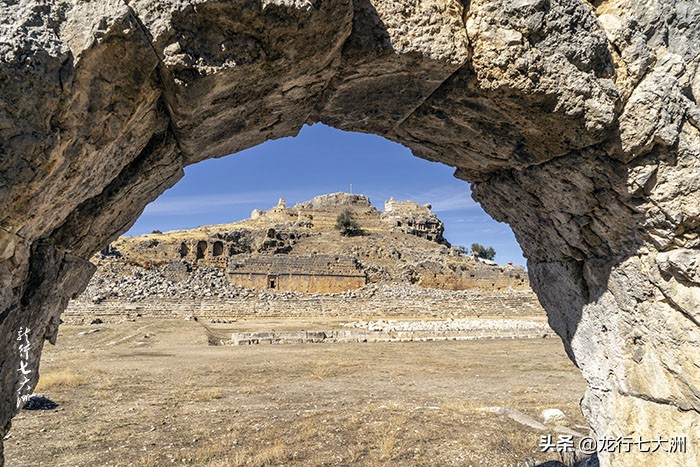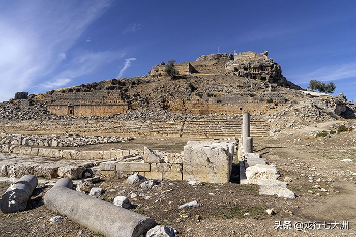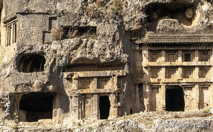 来这里首先看到的是利西亚崖墓,非常醒目。这些崖墓在山岩上雕凿,正面模仿了吕西亚传统的木制建筑的结构,分为房屋型墓葬和庙宇型墓葬两种形式。其中最醒目的一个大型的庙宇型墓,四面柱尚未完成。