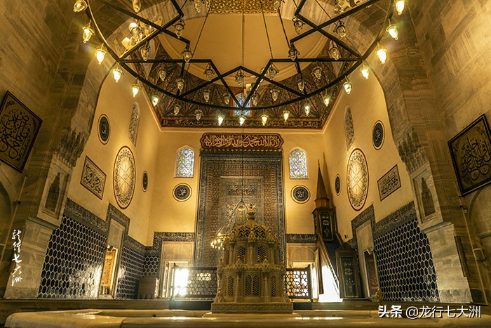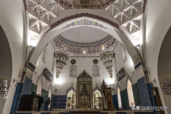进入清真寺到达穹顶中央大厅,厅内有15米高的米哈拉布(mhab,朝向麦加圣地的壁龛)。内墙上蓝绿相间的瓷砖就是这座清真寺名字的由来,墙上还有一些原始的古老壁画的遗迹。