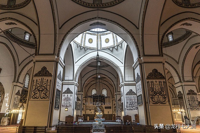 巨大的乌卢清真寺在阿塔图尔克街上,这是一座非常显眼的塞尔柱式建筑,也是布尔萨最壮观的一座清真寺。1396年雷霆巴耶塞特(Yildirim Beyazit)出资修建了这座伟大的建筑。乌卢清真寺不失为建筑上一个大胆的展示。两座高耸入云的宣礼塔和20个穹顶,让整个建筑显得雄伟壮丽,寺内的修建则沿袭了“越大越好”的原则,建有巨大的入口和方柱群。讲道坛和传教者的椅子上都有精致的木质雕刻,墙上还刻有书法艺术作品。