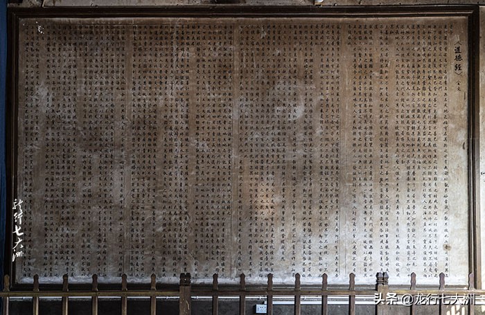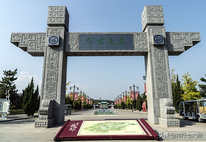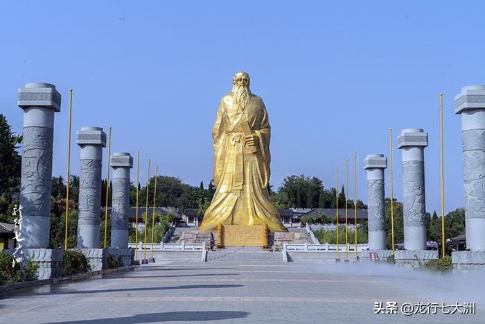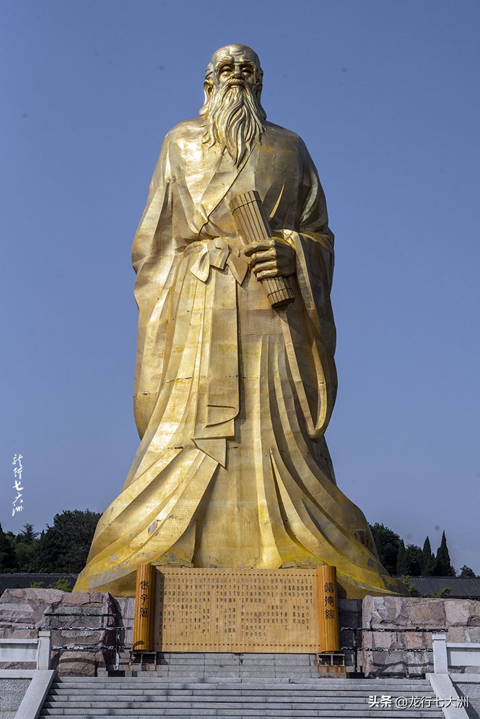 进入函谷关景区,穿过新建石牌坊的“今古通道”,迎面看到的就是金色的“老子”巨像,其手握竹简,凝视远方,巨像下面就是他的传世之作——《道德经》。