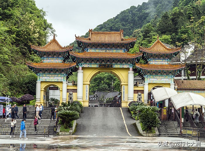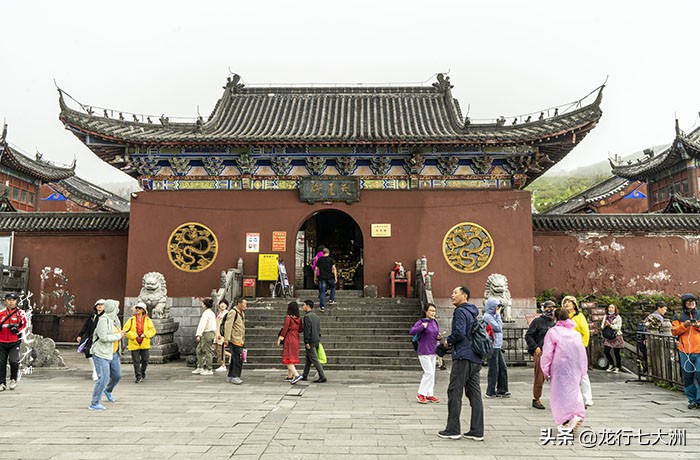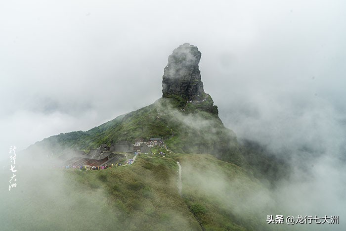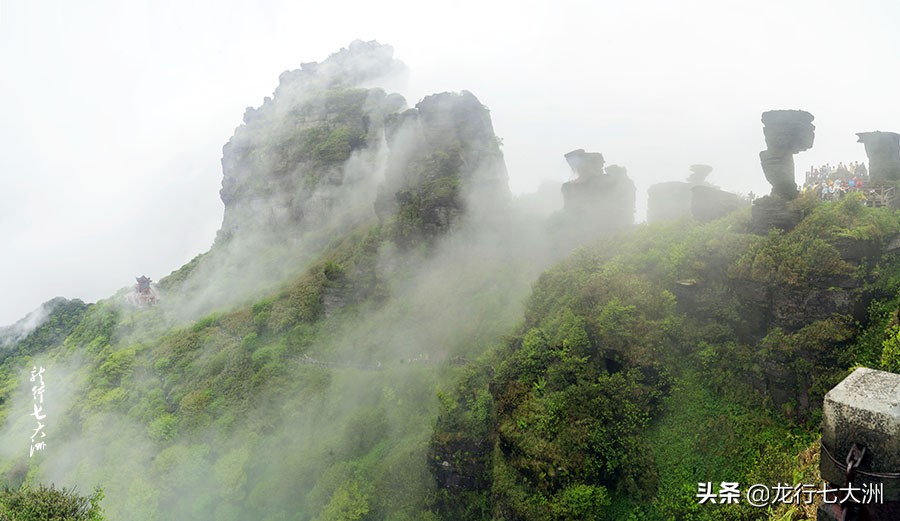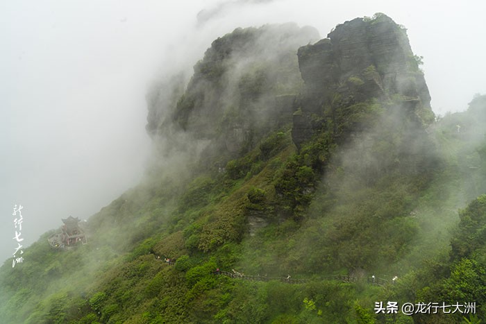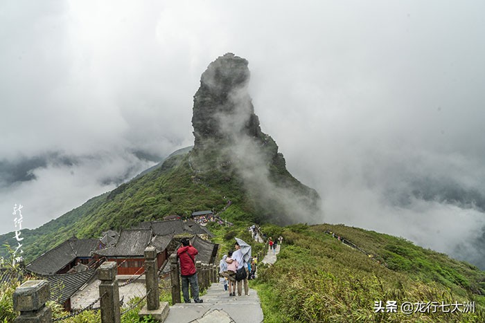 蘑菇石右侧是去老金顶的小路,有少数人去探奇的;红云金顶是梵净山的主要标志,在蘑菇石左侧的下山路上,下山乘索道就要经过红云金顶山下,山顶上有寺庙,等这个进度的人很多,但山路陡峭湿滑,是身强力壮者的选择,我只能远处看看,过过眼瘾罢了。红云金顶山下是承恩寺,在寺前的观景平台可近处观赏红云金顶。