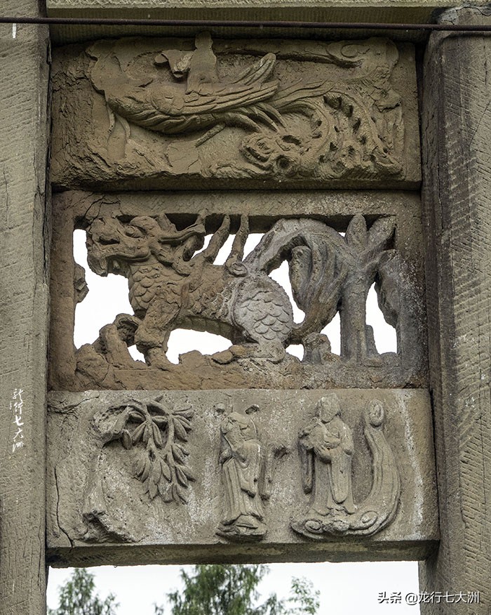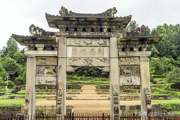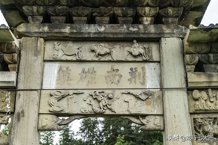 现在土司城遗城保存最为完整的石牌坊,是明天启三年(公元1623年)修建的,正面刻着"荆南雄镇",反面刻着"楚蜀屏翰",两面镌有"土王出巡"、"渔南耕读"、"云吞雨雾"、"哪咤闹海"、"槐荫送子"等浮雕图案。