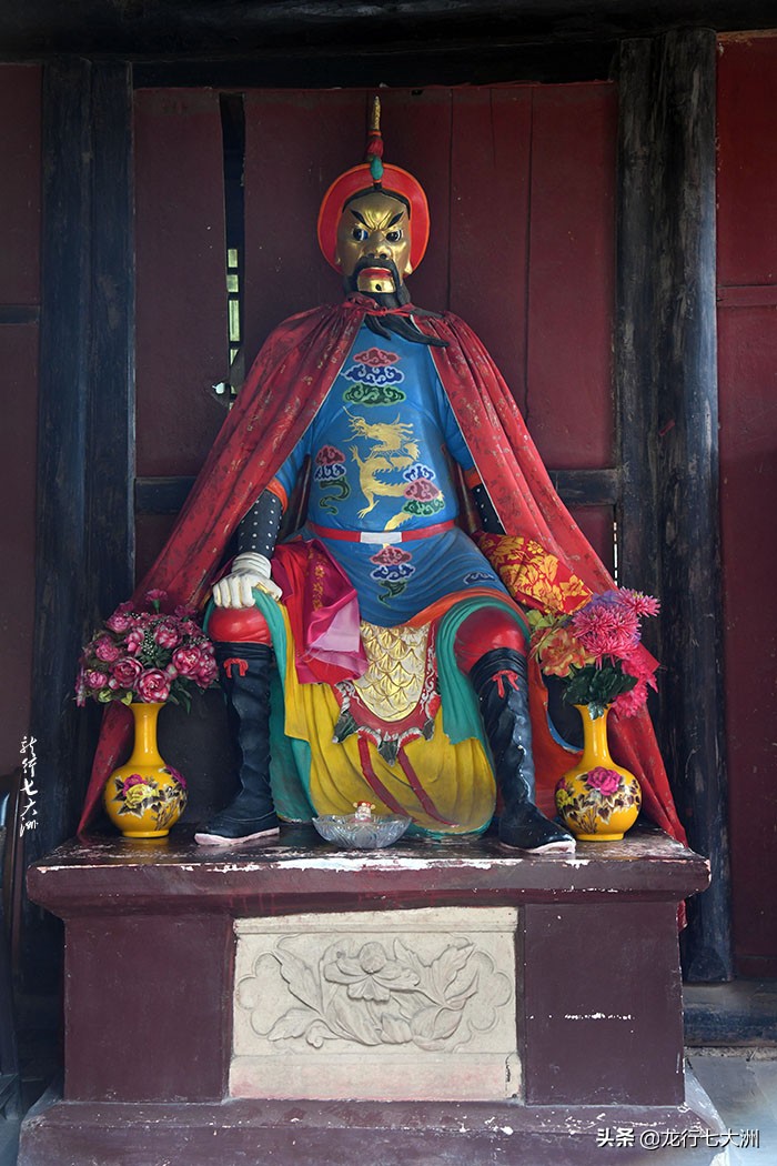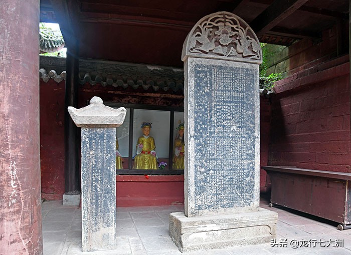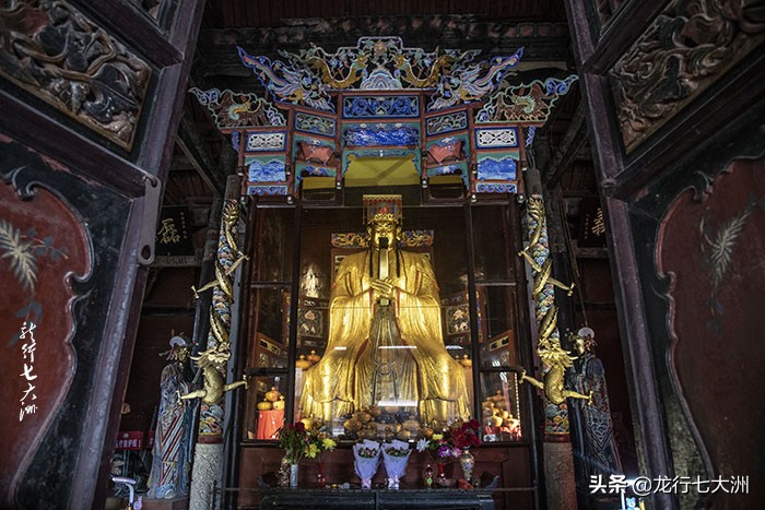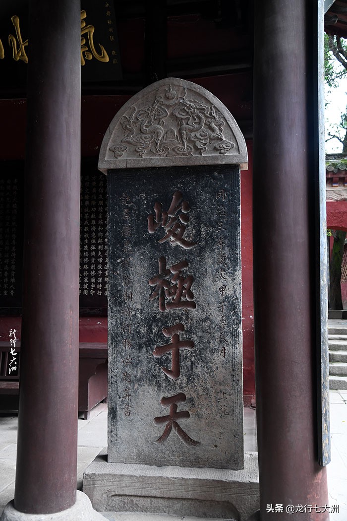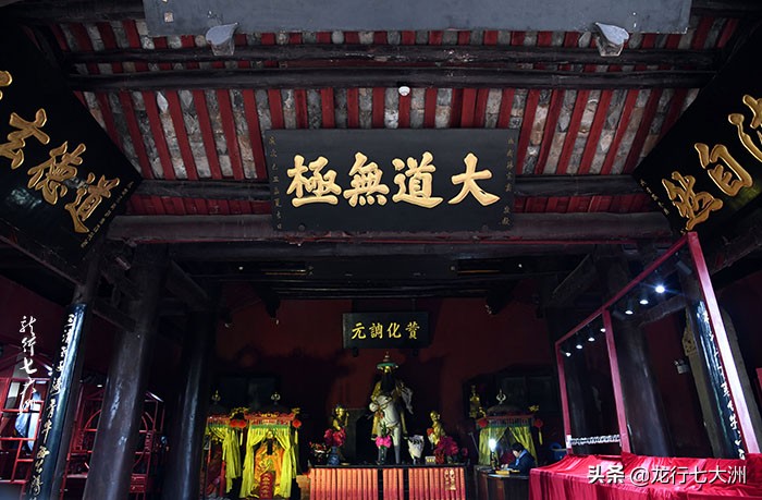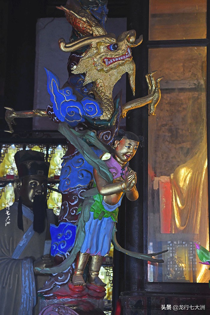 迈进帝乡大门,首先看到的是中间嵌有九龙石壁的二十四级石阶,二十四级石阶象征传统的“二十四孝”,巨型九龙石壁显示出文昌帝宫的帝王等级。石阶之上,是文昌宫正殿,又名真庆宫,始建于明代,清雍正十年重建。此为供奉文昌帝君的主殿,殿中间这位头戴冕旒、身着九龙袍、慈祥和善的铸铁像就是文昌帝君张亚子。殿内文昌及侍从群像均为明代空心铁铸造像,极为珍贵。