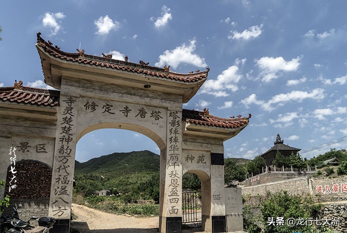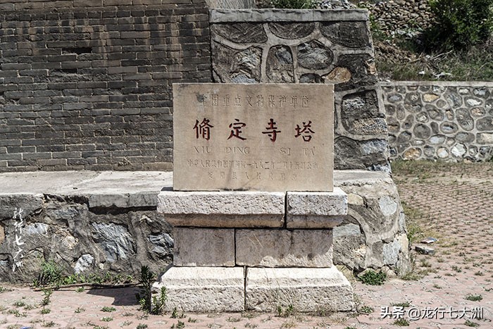 进入小村,穿过横额上写着“修定寺唐塔”的牌楼,就能看到右面高台上的那座唐塔了,台基上“天下第一塔”五个红色大字非常醒目,塔基下右侧是国务院的那方修定寺塔的“文保碑”。