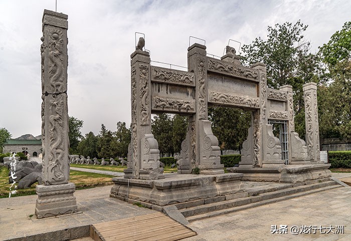 进入次妃墓的大门,迎面就是那座雕满云龙和牡丹花的白石牌坊,穿过石牌坊,能看大高大的祾思门,门前台阶的中央是长约10米的雕刻云龙江山图案的陛石,更显其高贵无比;穿过祾思门是享殿的遗址,一座白石雕刻的次妃像立于享殿之上;过享殿,穿过棂星门,正面就是石五供、明楼和后面的地宫、宝城了。