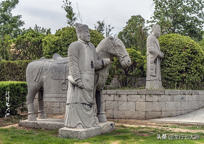过第一道石坊进入长189.5米的神道,两旁排列石人、石兽15对,形象有文臣、獬豸,狻猊,麒麟、骆驼、象、羊、马及神化了的其它怪兽,或立或蹲或卧,形态各异,栩栩如生。最后一组驭马官则纯粹是明代宦官风格。石人、石兽均采用整块青石雕成,其中最大者高2.77米,最小者亦有1.55米。四百多年来,虽经历代沧桑,风雨剥蚀,仍保存完好,细部纹饰清晰,实为难得的一批艺术珍品。