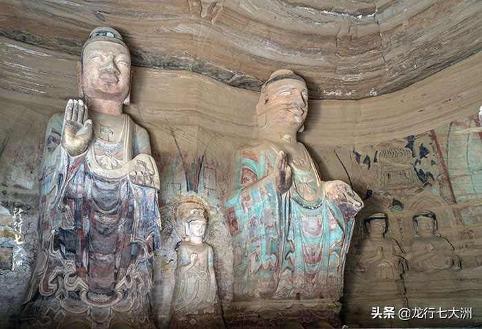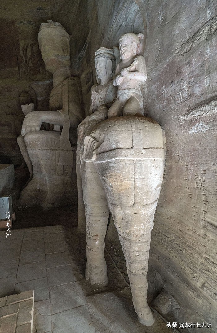 另有胁侍菩萨十身,高4米。前壁南北两侧交脚菩萨各一身,高5.8米。门南侧雕一菩萨、弟子及驭象奴乘于大象之上,通高3.05米;北侧雕三头四臂阿修罗天,通高3.1米。窟门外雕二天王,高5.7米身穿铠甲,两侧雕雄狮,虽年久残损,但威态犹存。