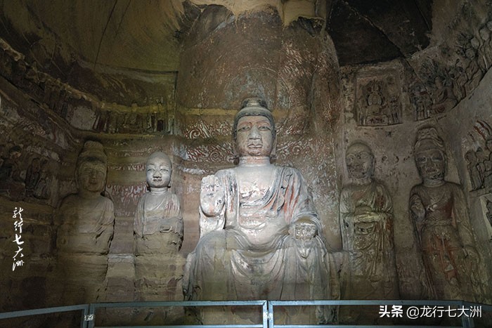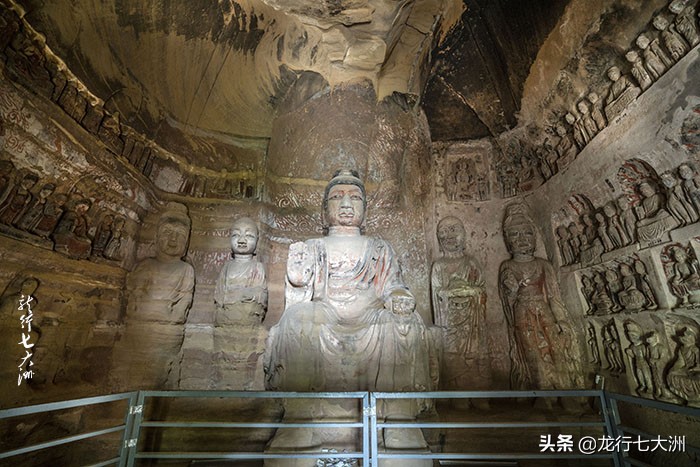 在所有窟龛中,165号窟是北石窟寺最大的一个具有代表性的洞窟,也是中国最大的“七佛窟”。此窟位于窟区正中,开凿于北魏永平二年(公元509年)。其坐东面西,覆斗顶大窟,窟高14.5米,宽21.7米,深15.7米,窟内造像主尊为七佛,高8米,磨光高肉髻,面相方圆,细眉大眼,鼻大唇厚,体魄雄建,褒衣博带袈裟,施无畏手印。