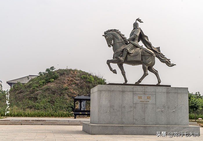 沿班超纪念馆前的木栈道向下不远处就是班超墓,墓碑上书“东汉定远侯班超之墓”,墓前有青石铺就的一小广场,广场中央是班超铠甲佩剑跃马西域的雕像。