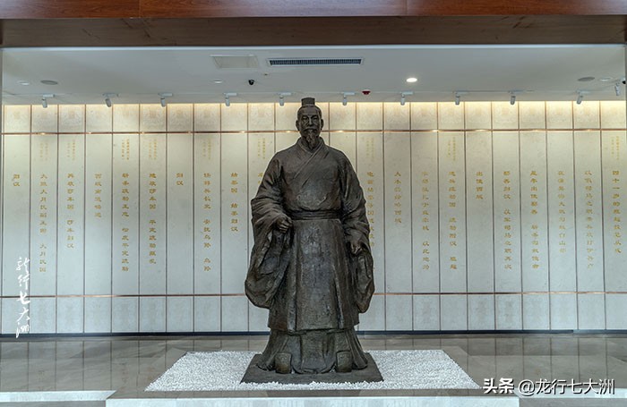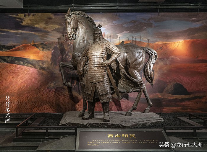 展厅最明显之处有班超“文官”和“武将”雕塑各一尊,是班超“投笔从戎,固守西域”的写照,武将的造型是以“西出阳关”为背景,雕像前是班超从洛阳到西域各地驻守的点线图。