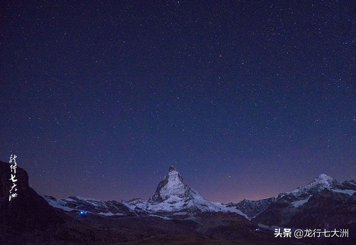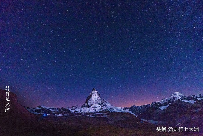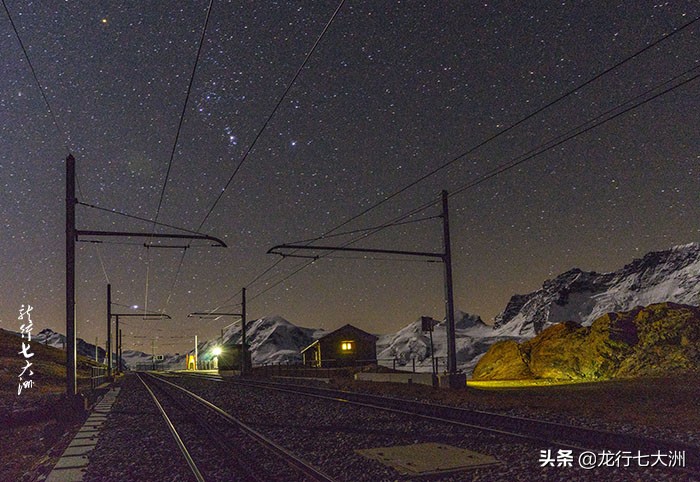 洗手间的暖气很暖和,但一夜也没有睡着,在迷迷糊糊中等待清晨的到来。夜里还来外面两次,看看天气是不是依然晴朗,看到夜空繁星满天,心里踏实多了。拍摄几张星空中的马特洪峰和夜间罗滕博登火车站的图片。