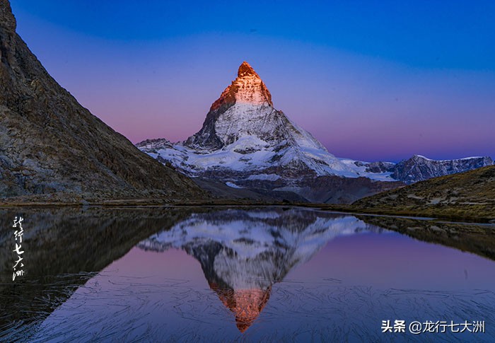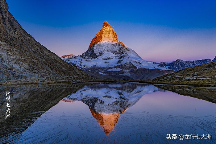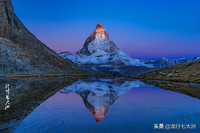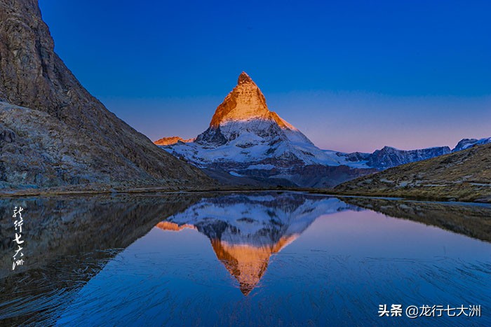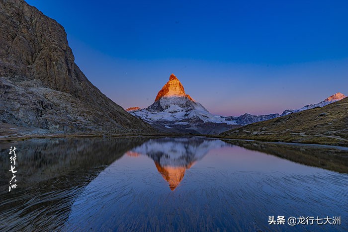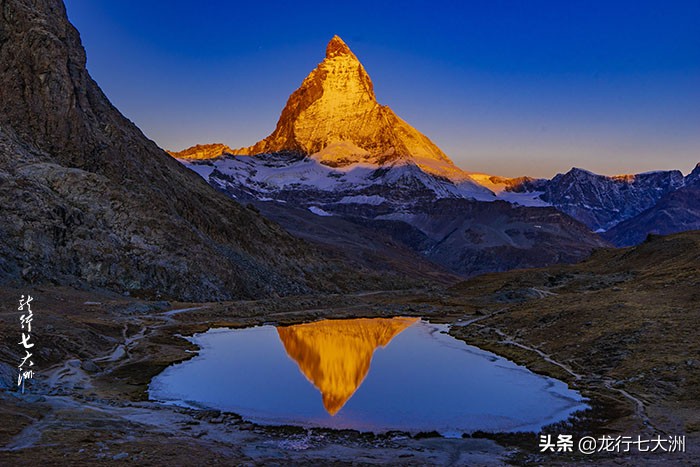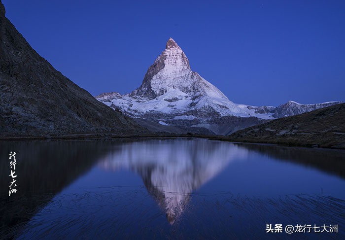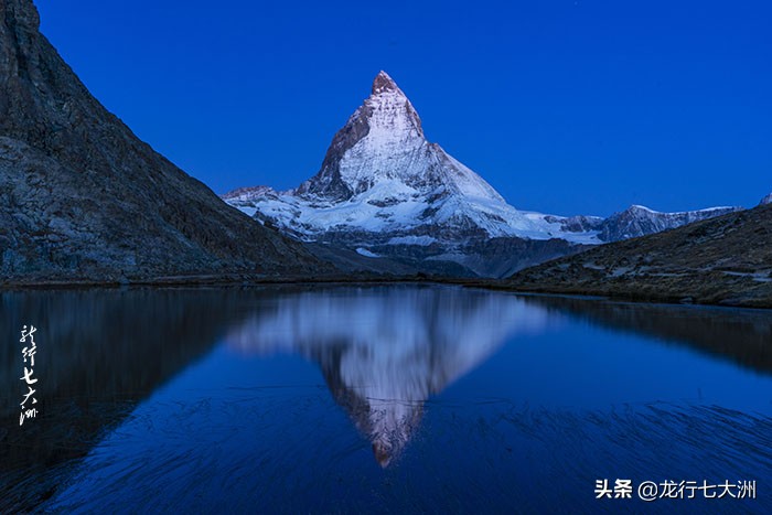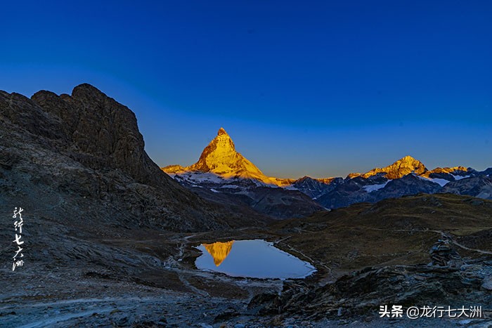 我在杂志和网络上多次看到马特洪峰的图片,最吸引我的图片是清晨有倒影的马特洪峰,红色的尖顶仿佛像一把闪着红色光芒的利剑,刺向晨曦碧蓝的天空,其三角造型又仿佛是一座天然的金字塔,在蓝天的衬托下,显得庄重、挺拔、雄伟。我查到拍摄照片最佳位置的那个湖——利菲尔湖(Riffelsee Lake),也把这里设定为我的拍摄点。