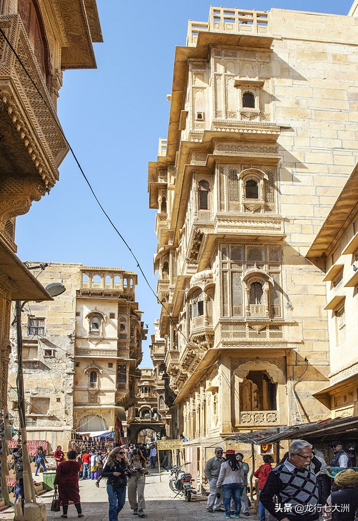 我观赏了几处哈维利的外景,并在萨利姆·辛格哈维利(Salim Singh-ki-Haveli )入内参观。在这座哈维利前有一个石雕大象,很容易辨认。1815 年,当时的斋沙默尔总理萨利姆·辛格 (Salim Singh) 建造了这座哈维利。其造型独特,底层狭窄,顶层有大量的雕刻,据说这个haveli的灵感来自一只跳舞的孔雀的美丽姿态。这座建筑美丽迷人的雕刻,以及在建造时甚至没有使用一滴水的事实(整栋建筑结构中没有用到沙浆或水泥),使它成为一个充满传奇故事的建筑。