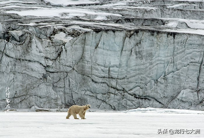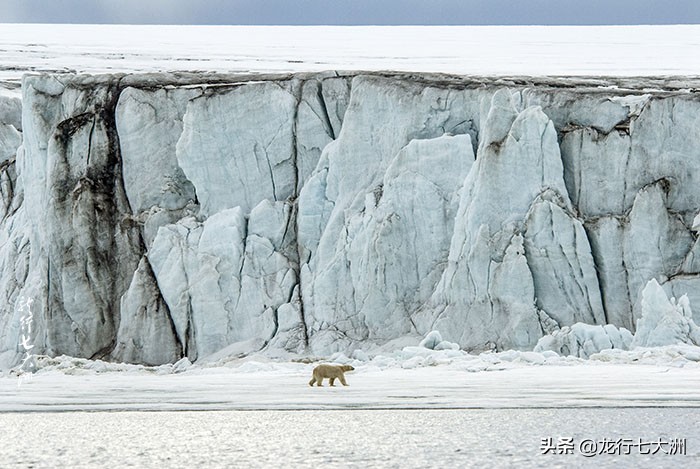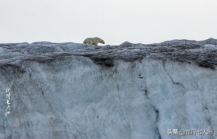 远远能看到有两只北极熊在冰川的下面和顶端漫步,尽管我们的橡皮艇尽量地靠近了冰川,但仍然太远了,我用600MM的镜头拍下来的北极熊也很小,但在高大的冰川衬托下,北极熊显得威风凛凛,更有北极兽王的风范。