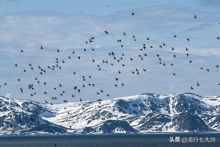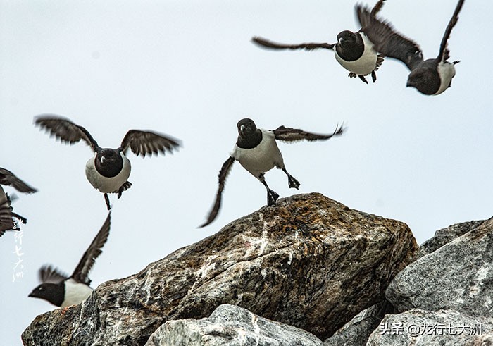 我们今天到达了富格尔桑根岛(Fuglesongen),这是个面积约仅为 4.1 平方公里的小岛,以有大量的海鸟而出名,最多的那种海鸟是小奥克斯 (Alle alle),我们一个上午都在观赏拍摄海鸟,小奥克斯有黑白相间的身体,盘踞在岩石上,憨态悠然,显得有点笨拙,很可爱,但敏捷的起飞又显得十分矫健。