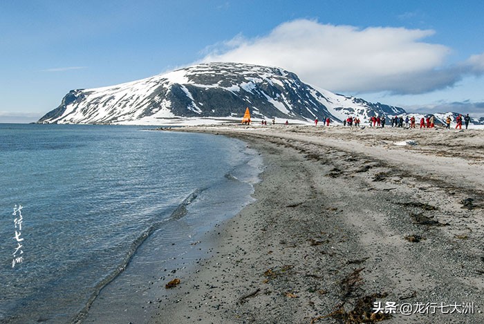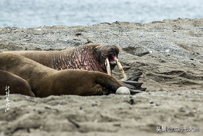我已经不知道船是沿着什么样的线路航行的了,今天来到了在斯瓦尔巴群岛的东南端岬角处,登上了一个不知名的小岛,在这里的沙滩上看到了几只海象,公海象有长长的牙齿。
