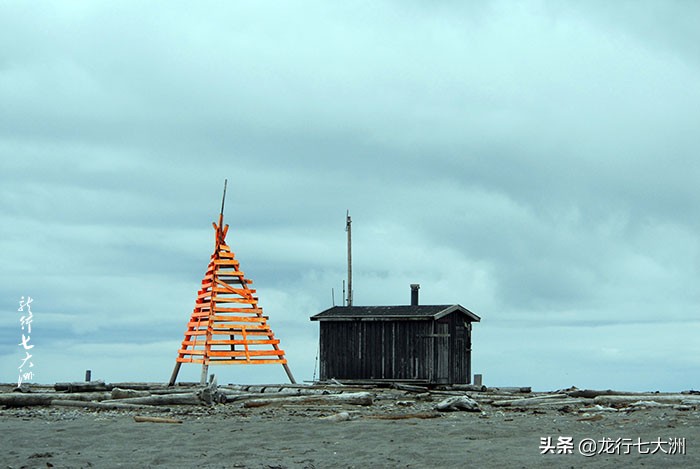 海滩上散落着很多的木板、棍