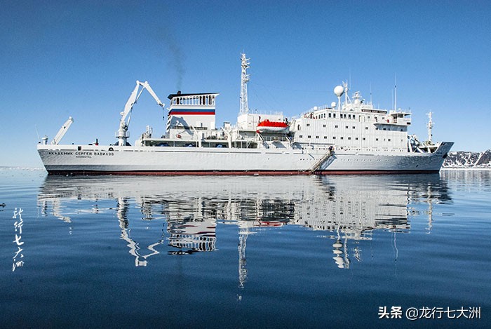这是一艘前苏联科考船改装的极地游船,船名:谢尔盖.瓦维洛夫院士号 Akademik Sergey Vavilov),白色的船身嵌在深蓝色的海水中,非常漂亮。