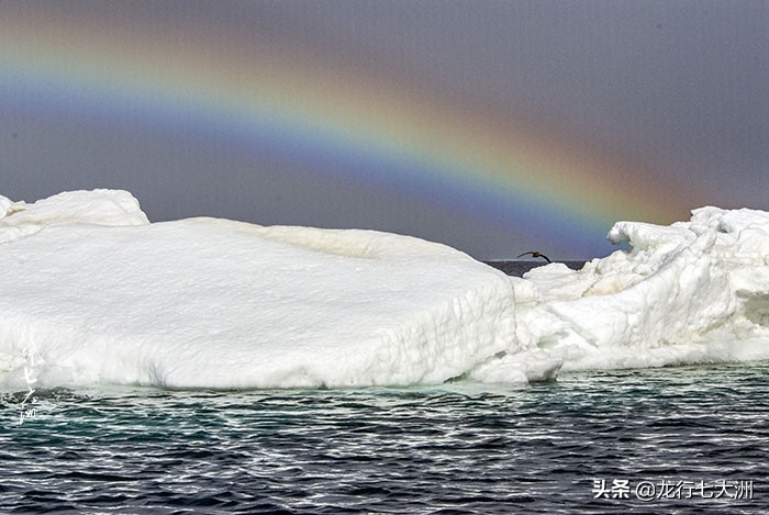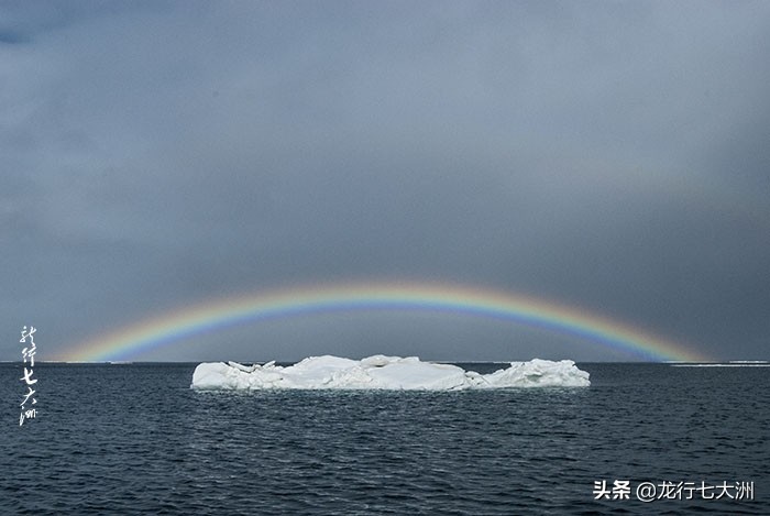 今天海上有彩虹,彩虹的半圆弧环不太大,但色彩绚丽,清晰明亮,我找到了块浮冰座前景,拍了一张浮冰彩虹的图片。