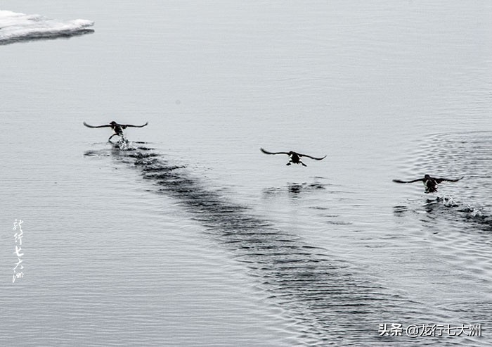 几只海鸟在船的惊扰下快速地起飞,在水面上留下了长长的一串脚印。