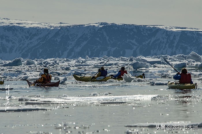 划独木舟在布满浮冰的海湾里穿行