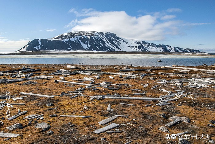 午餐后,我们的船来到了斯米伦堡(Smeerenburg),或称作“布鲁布伯镇”,这是一个废弃了的荷兰捕鲸站,建立于1619年,1660 年左右被废弃。我们结队上岛,去寻找捕鲸站的遗迹。海滩上散落着很多的木板、棍,它们之前应该是房屋的组件。