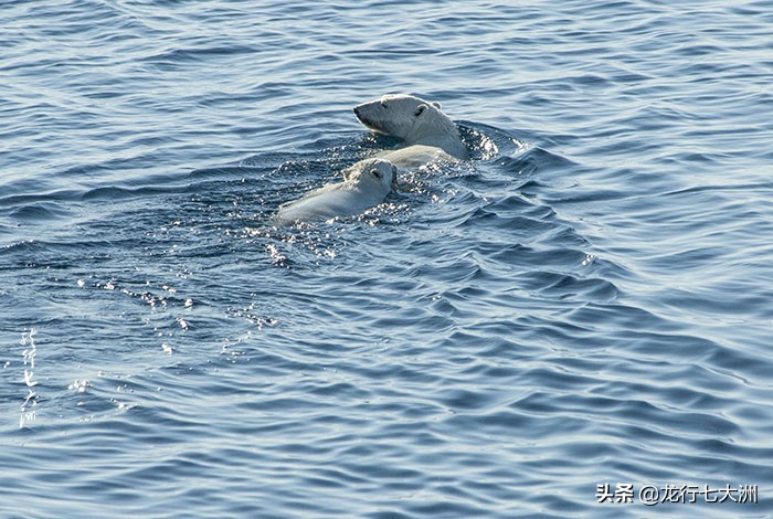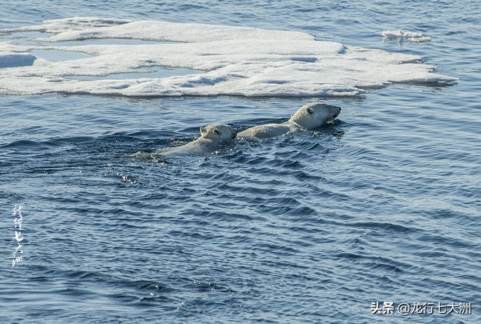 今天看到了两只北极熊——一个熊妈妈和一只小熊在船舷边游过。能看到它们都很瘦,日益恶劣的气候环境让它们的食物链近乎断裂,能看到它们前面的浮冰已经快融合了,很薄,但那里曾经是北极熊赖以歇脚的港湾。据说,很多北极熊因在海上找不到歇脚的浮冰而被活活淹死。