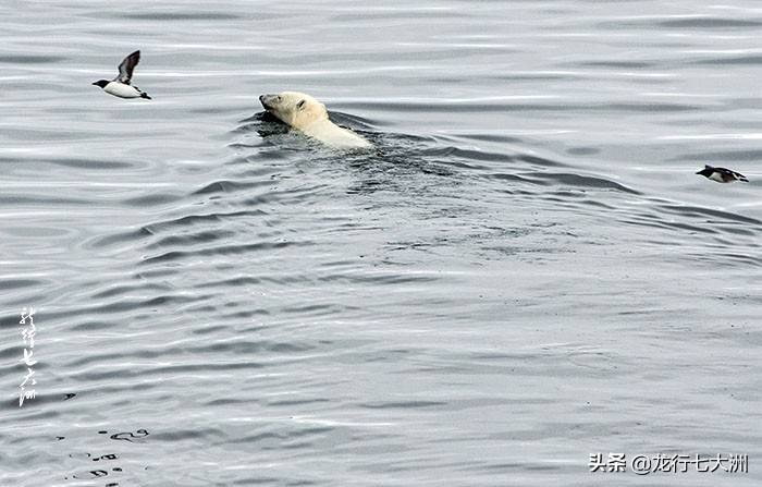 今天第一次看到了北极熊——一只游在海中的北极熊,几只海鸟在伴随着它,显得孤单无助。