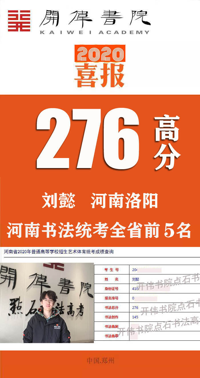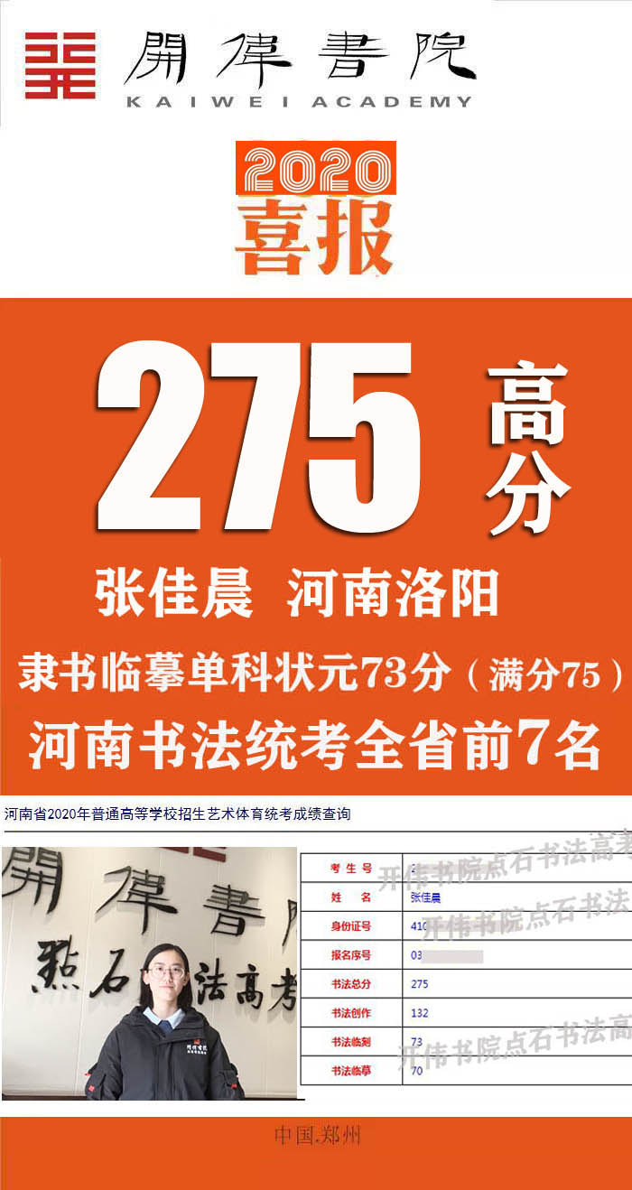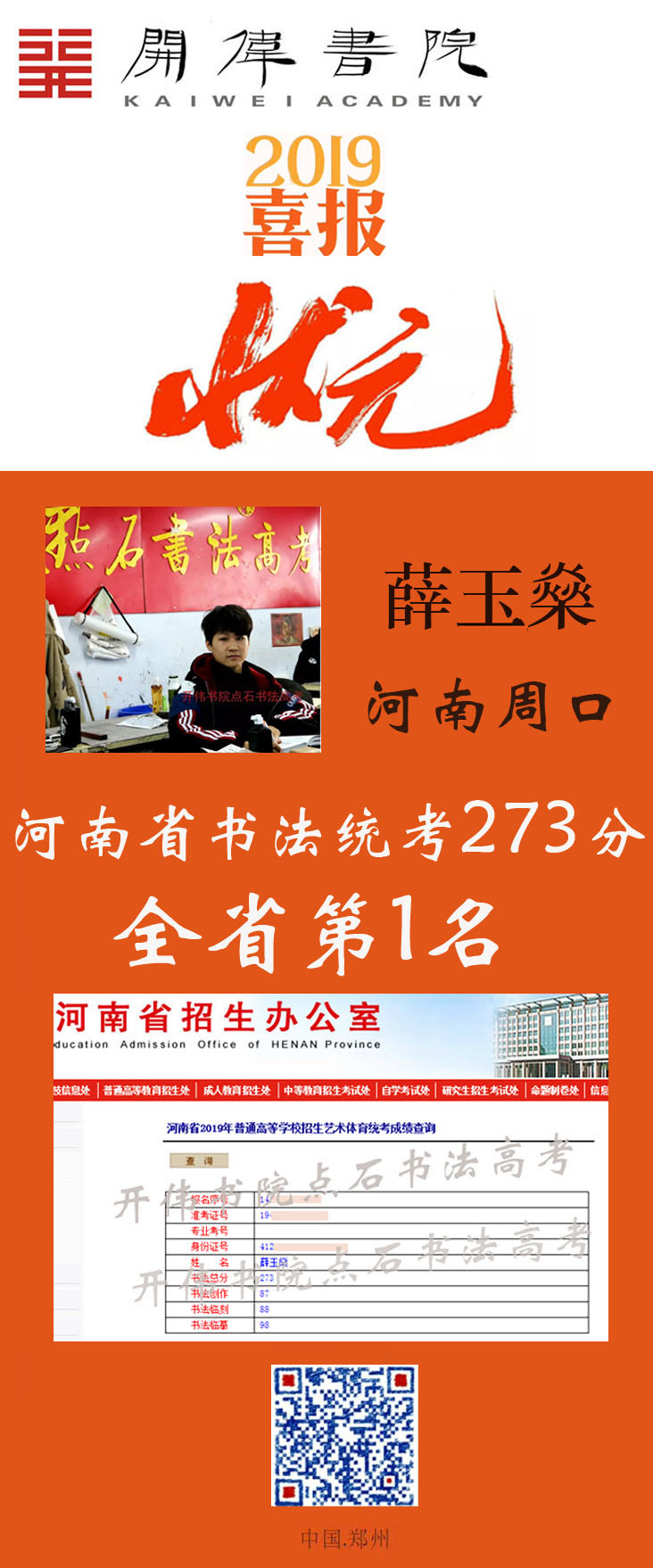 恭喜:薛玉燊同学以273分斩获2019年河南省书法统考全省第一名(状元)!