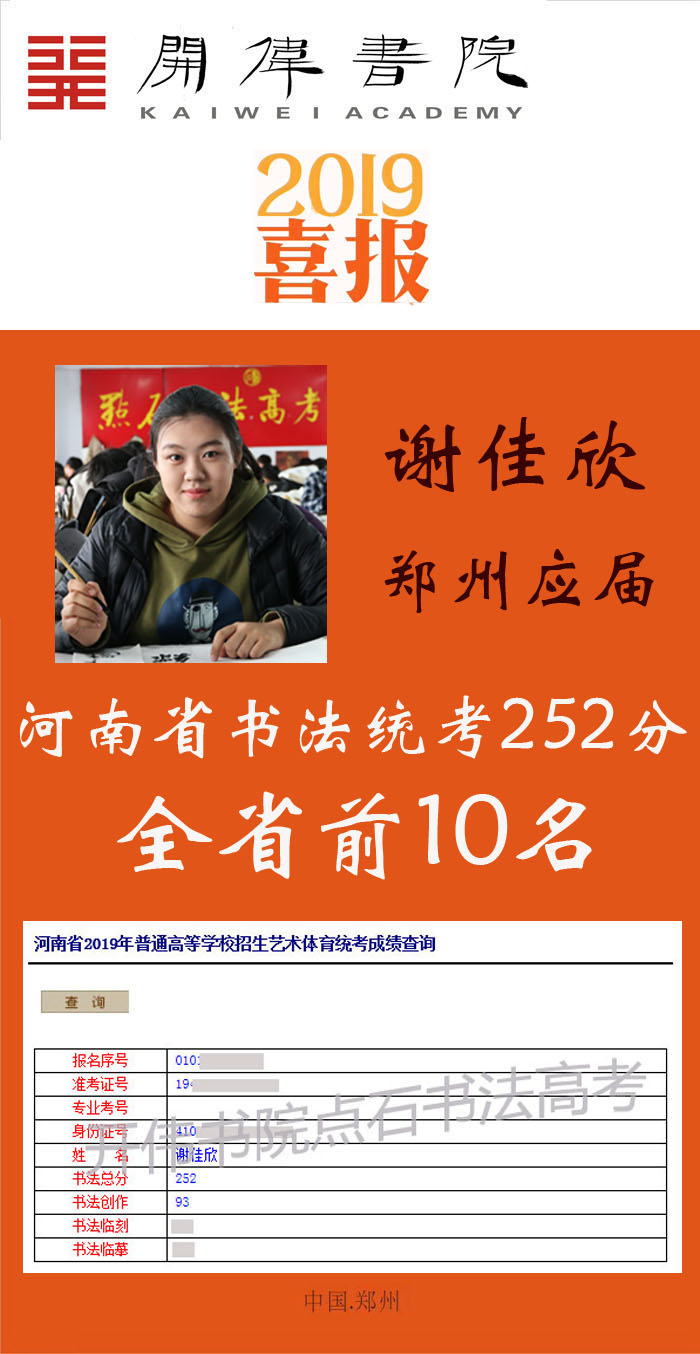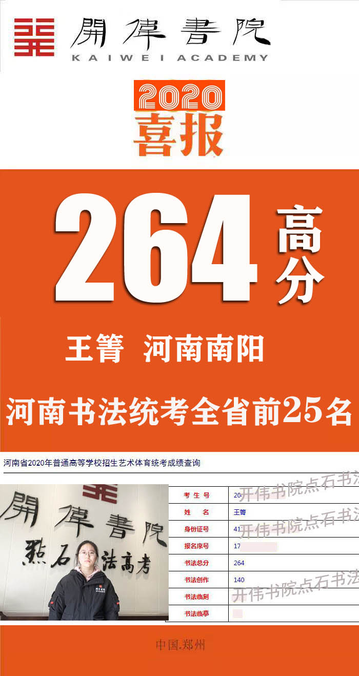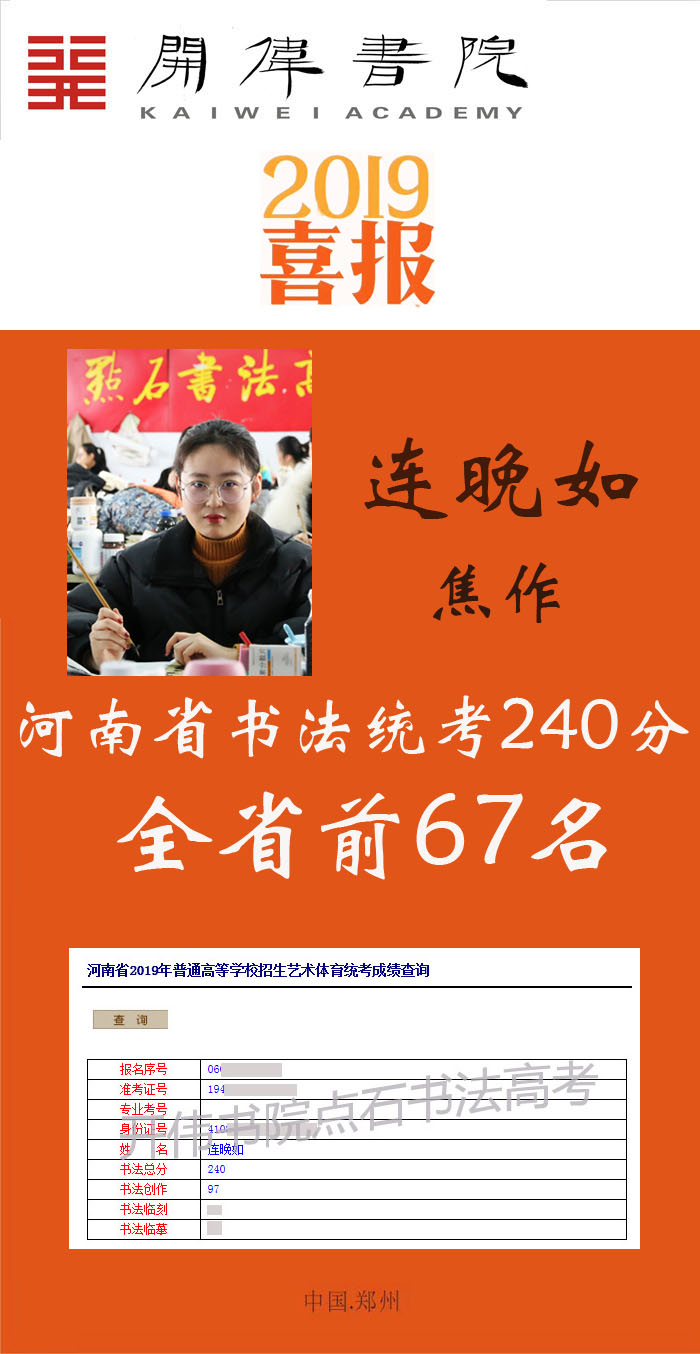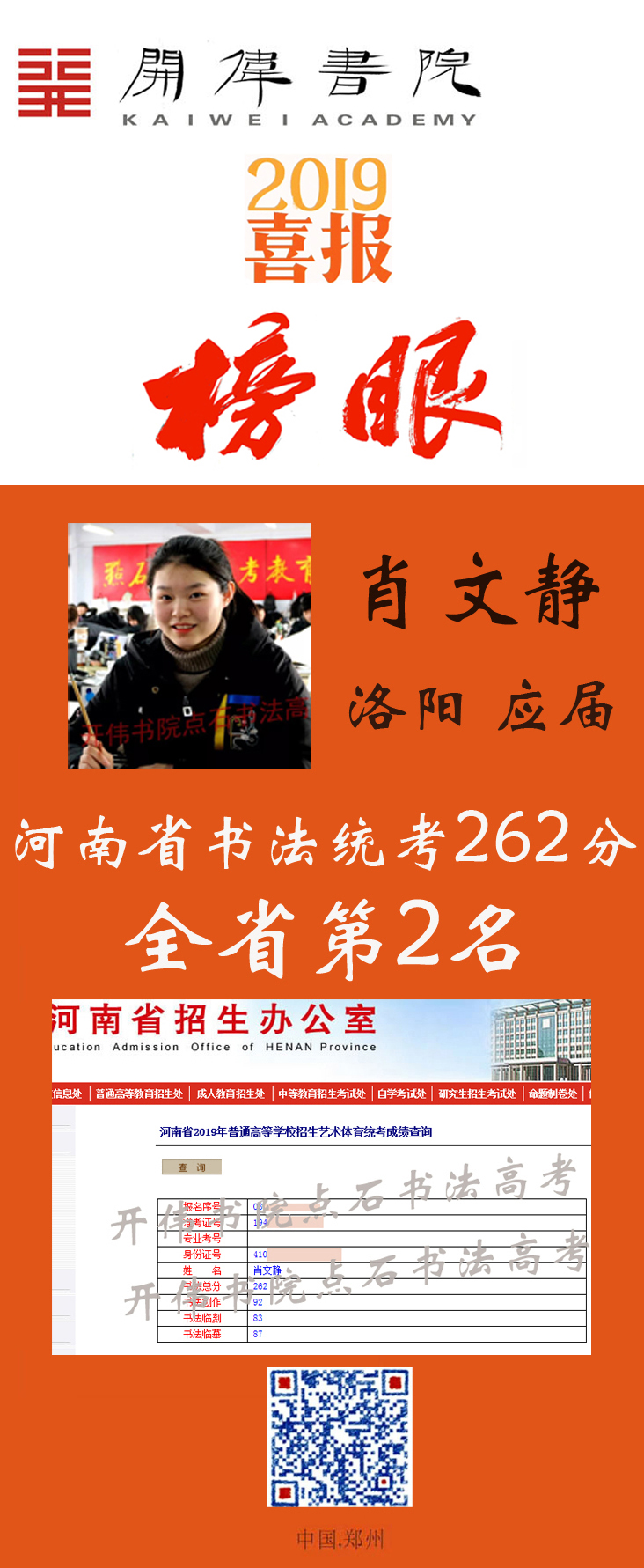 恭喜:肖文静同学以262分斩获2019年河南省书法统考全省第二名(榜眼)!