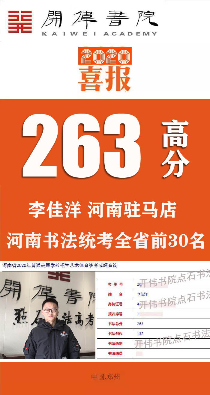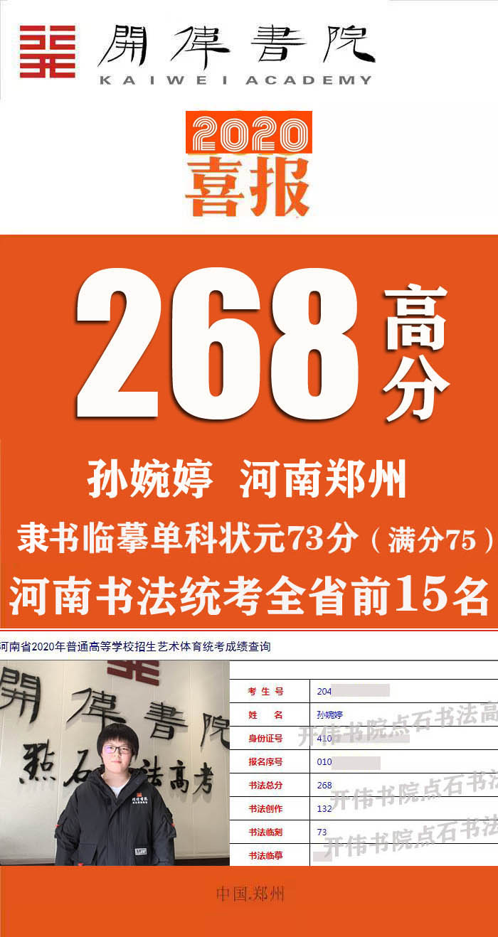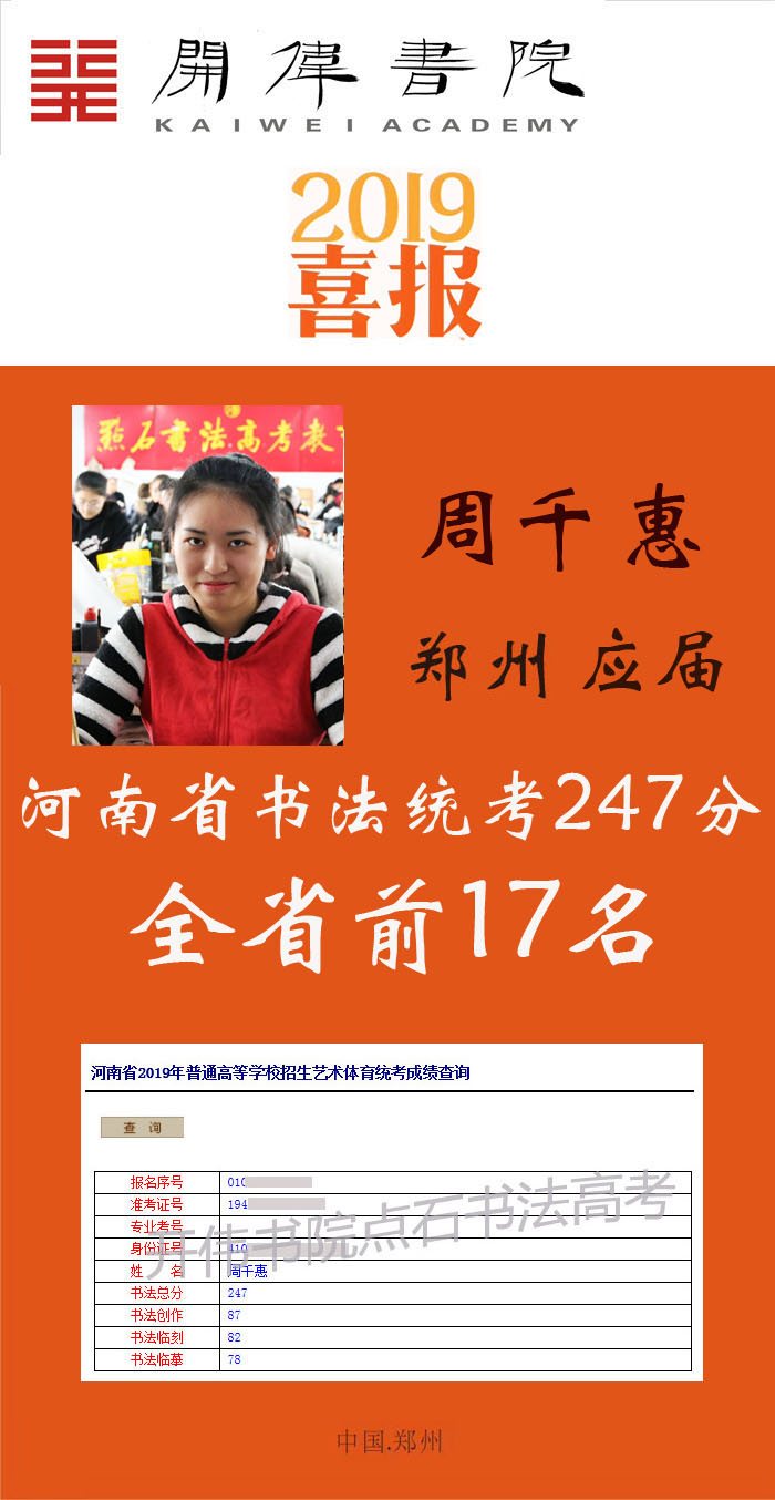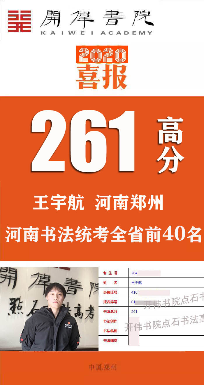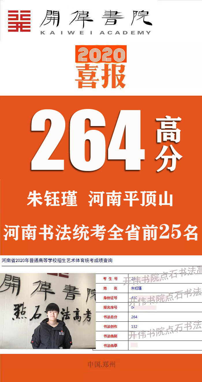 恭喜:肖文静同学以262分斩获2019年河南省书法统考全省第二名(榜眼)!