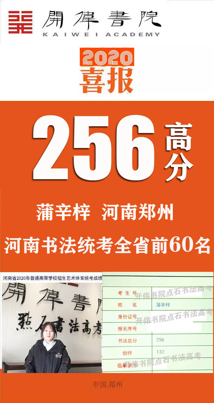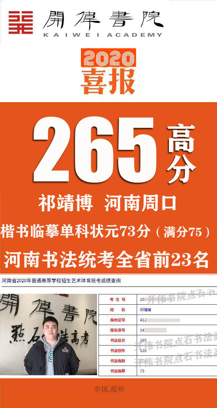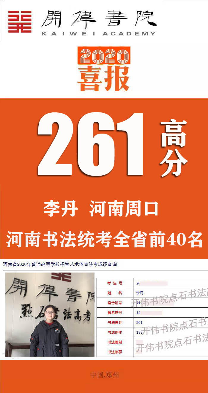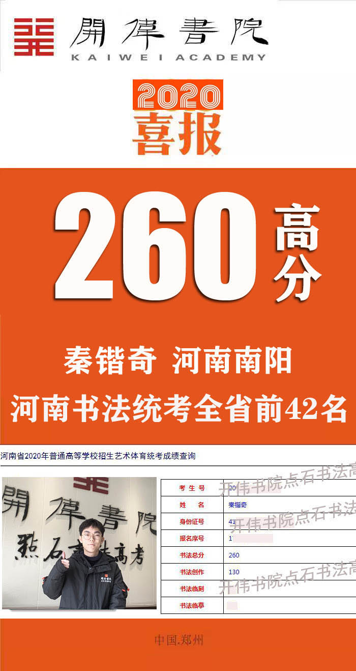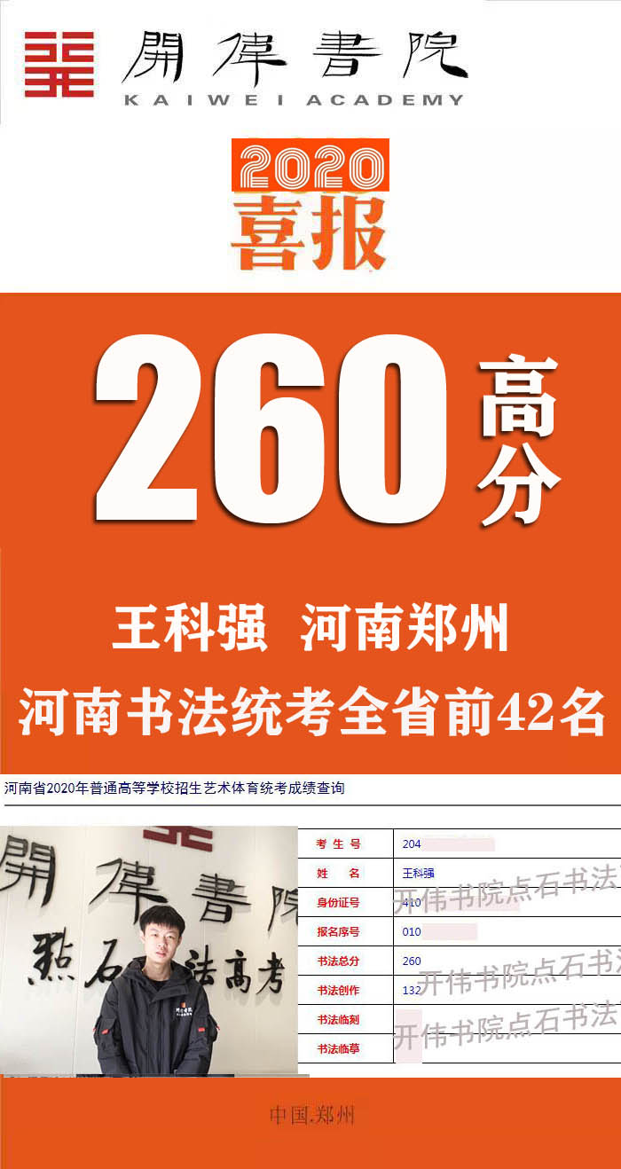 恭喜:肖文静同学以262分斩获2019年河南省书法统考全省第二名(榜眼)!