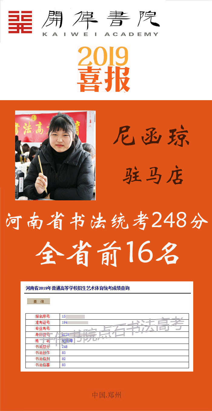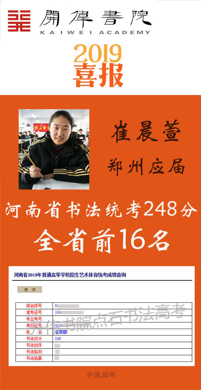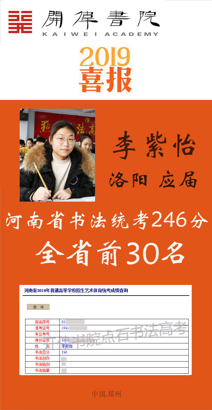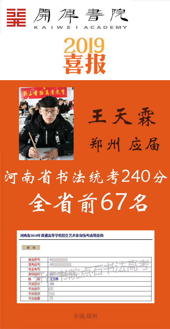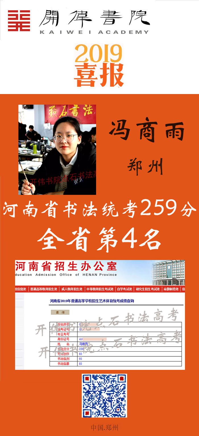 恭喜:冯商雨同学以259分斩获2019年河南省书法统考全省第四名!