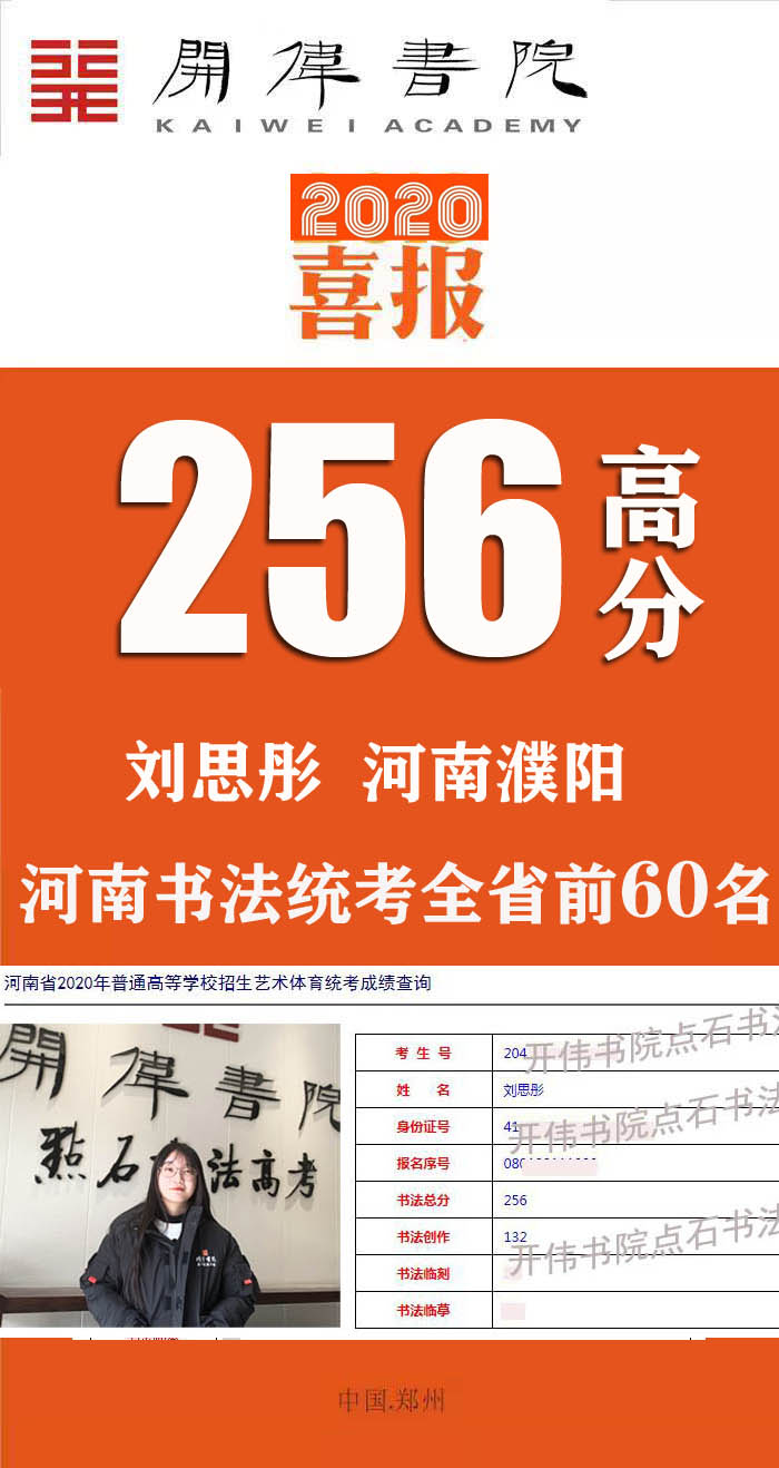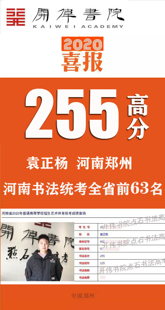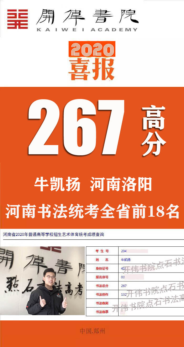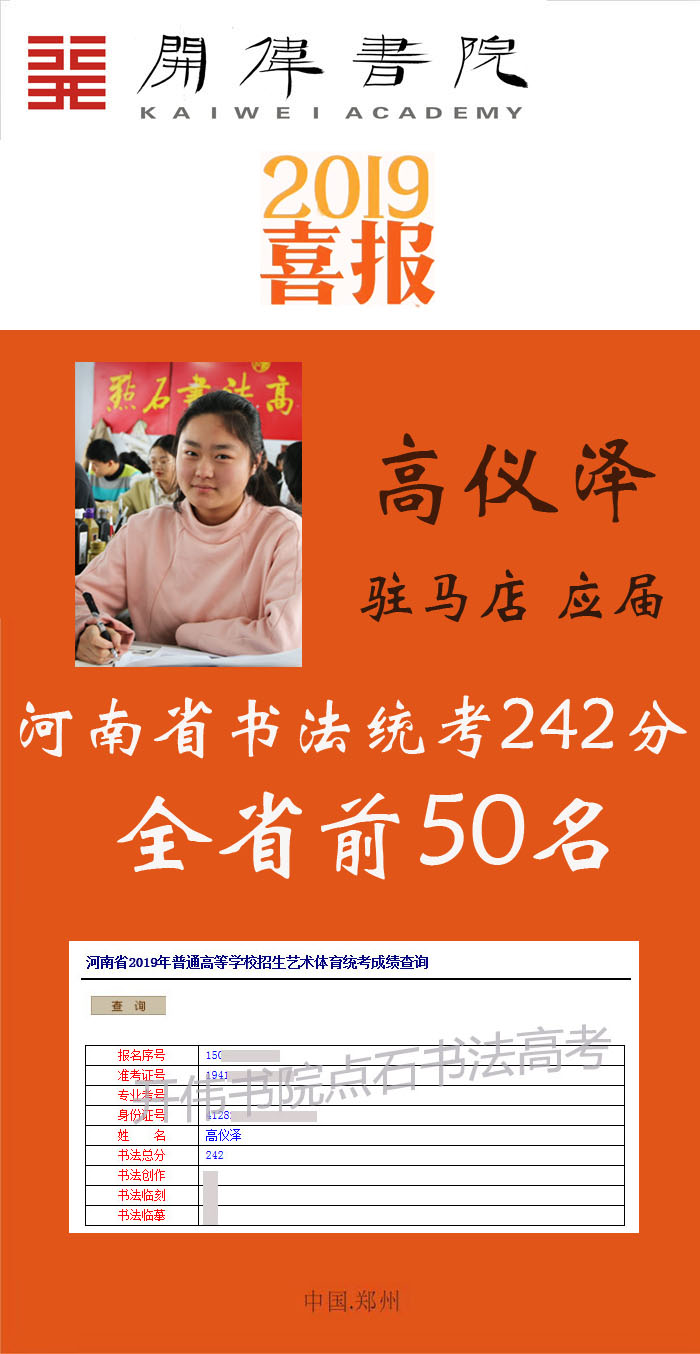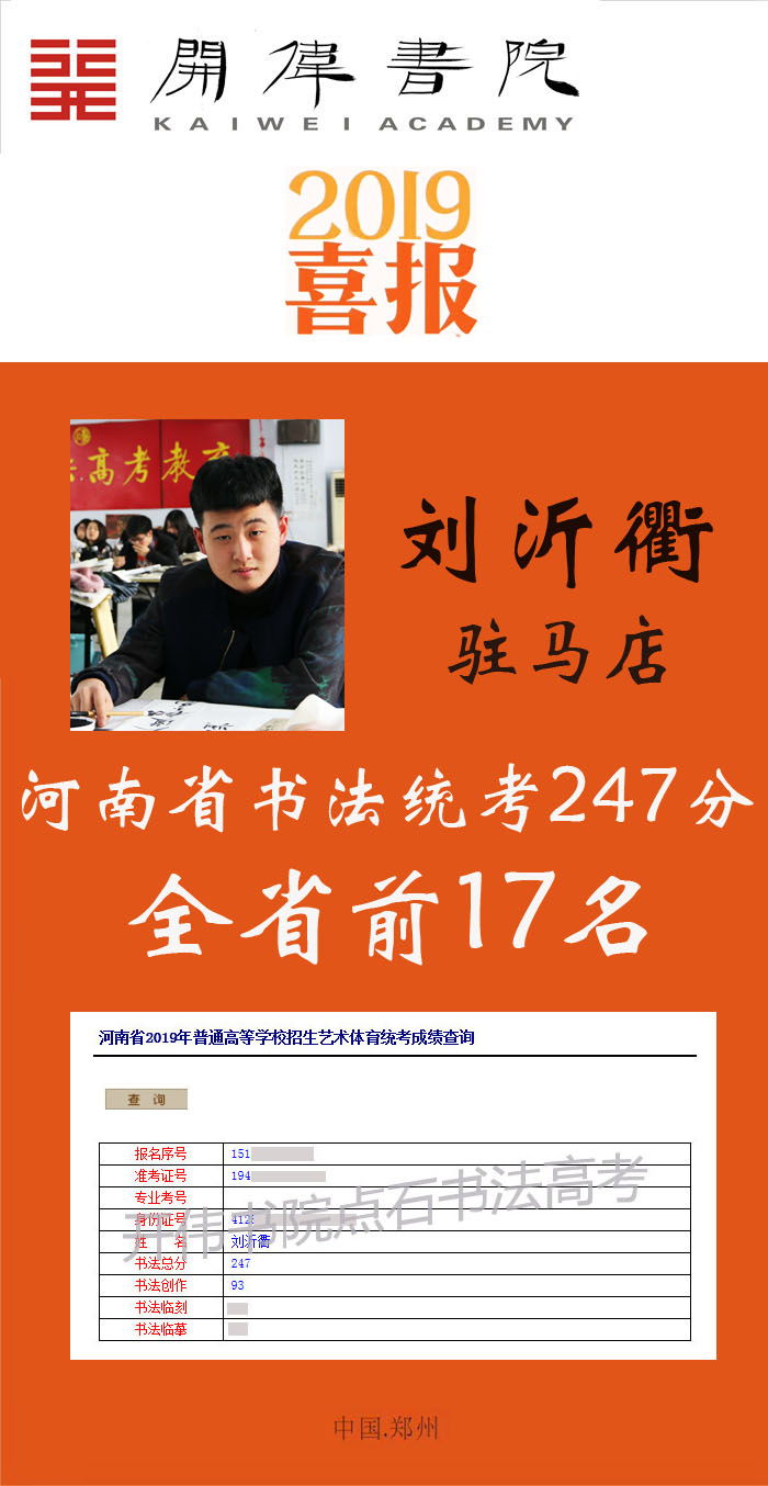 恭喜:冯商雨同学以259分斩获2019年河南省书法统考全省第四名!