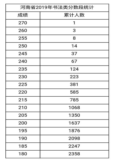 2019年河南省书法统考共有3500人报考,通过A段本科线(219分,公办本科院校书法专业)以上共600人。2019年我校河南籍学生共60人,考取219分以上57人,A段本科合格率达95%以上!B段本科(210 分,民办本科院校书法专业)合格率100%!校考资格线(180分)合格率100%!考取273分1人(占全省100%)!260分以上2人(占全省2/3)!250分以上4人(占全省近1/3)!240分以上17人(占全省近1/3)!
