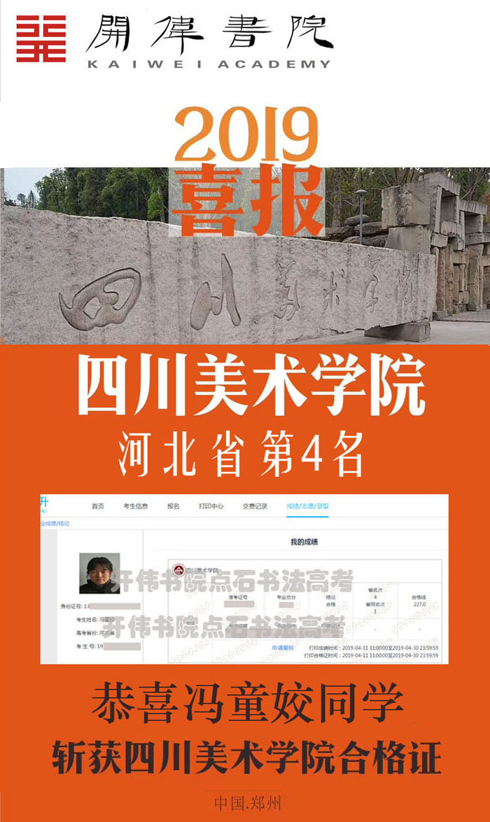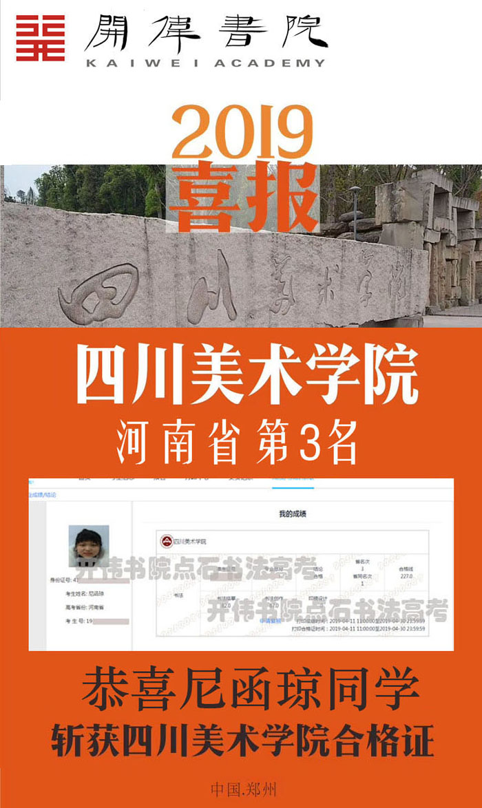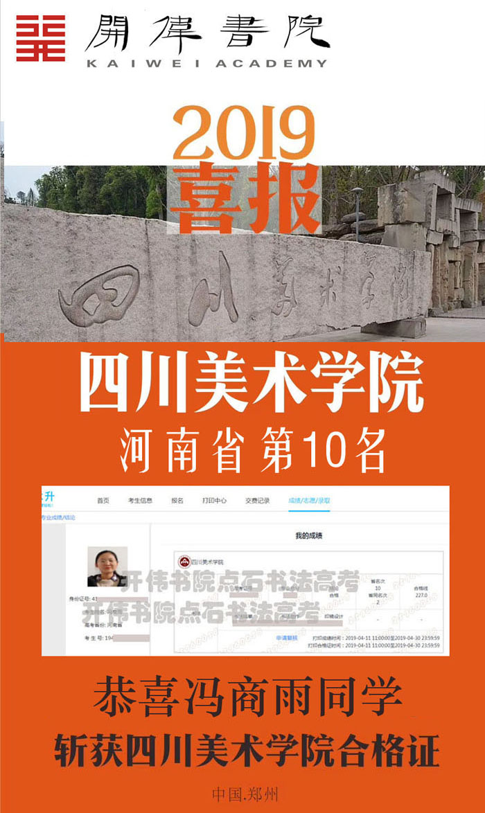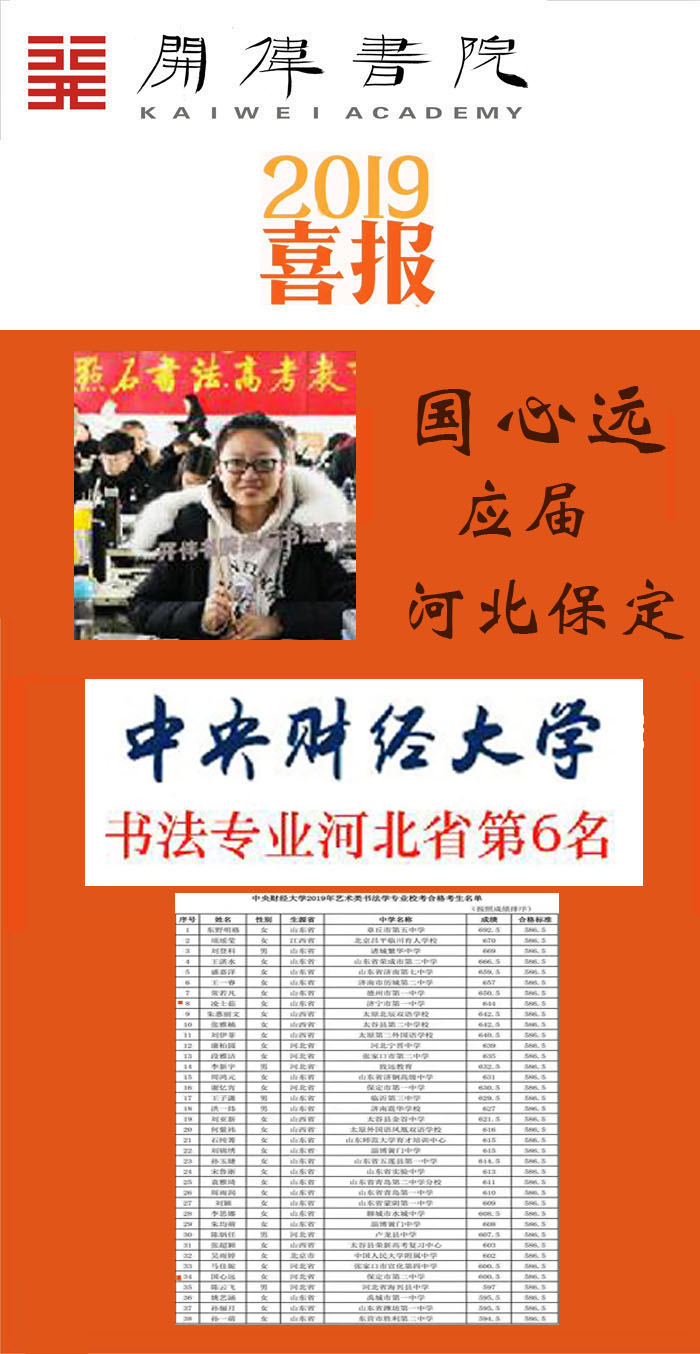 河南合格53人(2019年中央财大书法专业首次面向河南考生使用本省书法统考成绩录取,并根据省统考成绩在220分以上,方可报考,无须参加校考。我校河南籍学生考取220分以上53人,合格率90%)