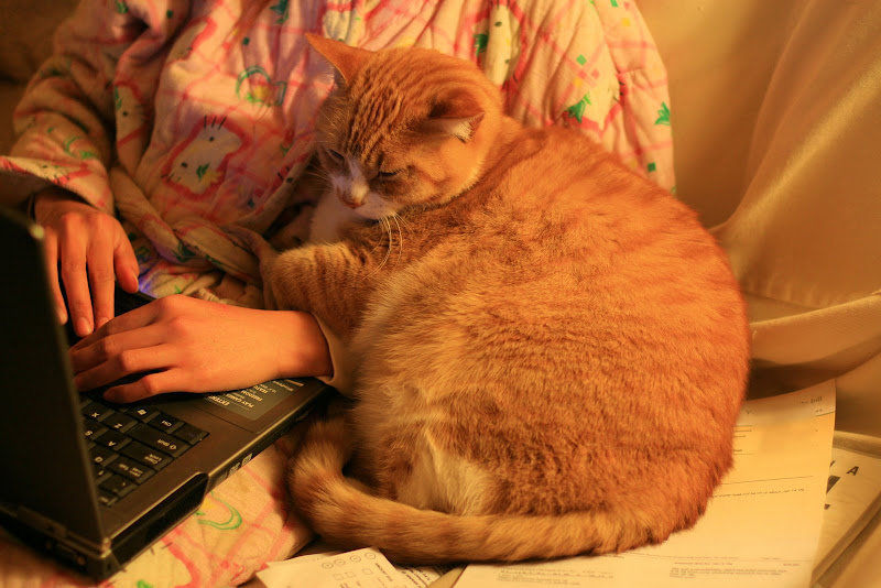 黄咪是流浪猫的娃娃,但是在幼年时就被我们抱回家,从小宠爱,没有受过苦,在家从来都是自由自在,无拘无束,想干什么干什么,现在6岁了,眼神还是纯真清澈,象小奶猫一样天真无牙。六年里我们搬了好几次家,从北加搬到南加,经历各种风风雨雨,天灾人祸,两只猫都是随遇而安,主人到哪里,它们就安安心心跟到哪里。只有一次长途几小时的UHAUL,让黄咪不知所措,一路眼泪汪汪,到了家才破涕为笑。也许以后还会搬家,其实住在哪里都没关系,有了黄咪这件贴心小棉袄,就能睡得香甜。
