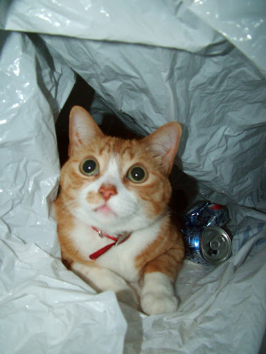 从Mt Shasta开车10小时回家,已经是半夜三点,离家门口还远,就听到家里传来鬼哭狼嚎声。可怜的黄咪,难道非要等主人等到深更半夜的么? 黄咪的习惯是迎接主人回家,天天如此,终年无休。它傍晚一般在床上睡觉,但一听到主人的脚步,就从床上跳下奔到门口。一开门,总能看到黄咪探出小脑袋,然后在我们脚上打滚。下午三四点是它睡得最不省猫事的时候,如果这个时候我们回家,黄咪出来迎接脚步会稍微慢一点,一般都是睡眼惺松,有时还只睁着一只眼。我们对它说,黄咪,你如果睡死过去了就舒舒服服睡,不用每次出来的,可是他这个小笨蛋没脑筋的,还是每回都摇头晃头地从卧室里走出来。扑到我们腿上时,眼神里满是期待,如果它能开口,说的肯定是“要抱!要抱!”等我们把他抱起来,大眼睛马上眯成一条缝,一脸心满意足地开始purr。 我们对黄咪是一见倾心的。还记得六年前的夏天,我们走进petsmart,看见一只桔黄色的小奶猫,极其活泼地在笼子里和其它小猫咪嬉戏打闹,马上知道就是它了。当时它才两个月大,我们把它托在手心里就回了家。本来是觉得Vanilla一个人太孤单,希望黄咪陪陪它,可惜Vanilla这个高贵的淑女极不待见黄咪小无赖,对黄咪爱理不理,黄咪倒也能自得其乐。